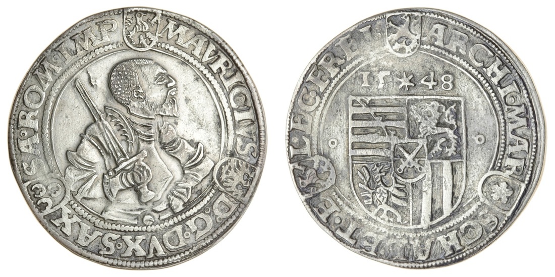(x) Germany, Saxony, Albertine line, Moritz (1541-53), Taler, 1548, Freiberg, armoured half-length right, with sword, rev. legend ends