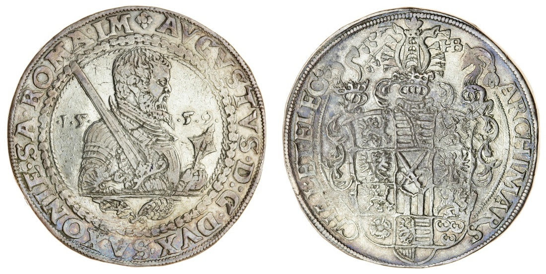 (x) Germany, Saxony, Albertine line, August (1553-86), Taler, 1559, Dresden, armoured bust with sword and sceptre right, dividing date, two shields below, rev. shield with three helms (Dav.9795), good very fine