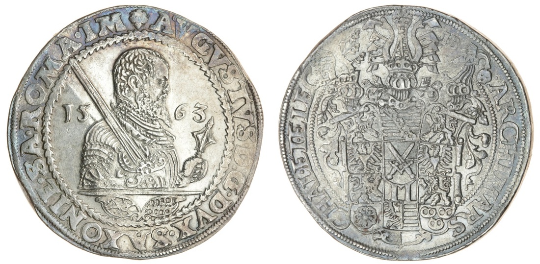(x) Germany, Saxony, Albertine line, August (1553-86), Taler, 1563, Dresden, armoured bust with sword and sceptre right, dividing date, two shields below, rev. shield with three helms (Dav.9795), about extremely fine