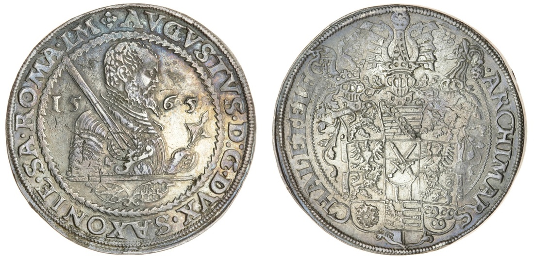 (x) Germany, Saxony, Albertine line, August (1553-86), Taler, 1565, Dresden, armoured bust with sword and sceptre right, dividing date, two shields below, rev. shield with three helms (Dav.9795), good very fine