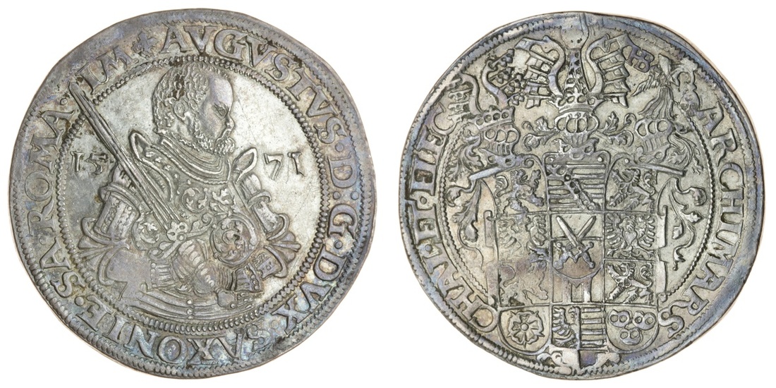 (x) Germany, Saxony, Albertine line, August (1553-86), Taler, 1571, Dresden, armoured bust with sword right, dividing date, rev. shield with three helms (Dav.9798), very fine