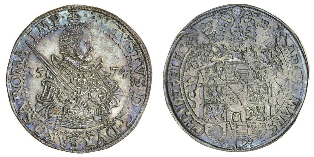 (x) Germany, Saxony, Albertine line, August (1553-86), Taler, 1574, Dresden, armoured bust with sword right, dividing date, rev. shield with three helms (Dav.9798), some light double striking, good very fine