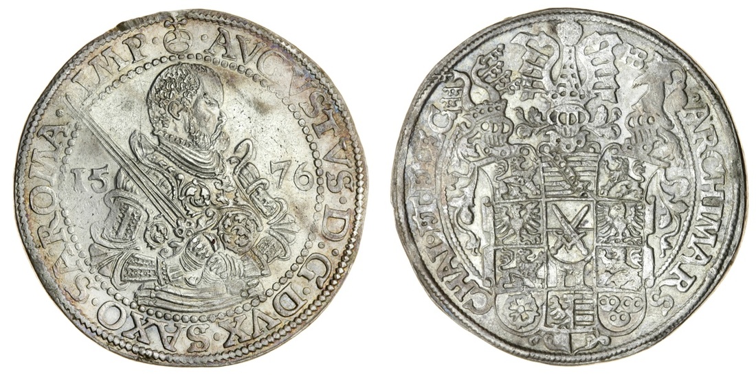 (x) Germany, Saxony, Albertine line, August (1553-86), Taler, 1576, Dresden, armoured bust with sword right, dividing date, rev. shield with three helms (Dav.9798), cleaned, good very fine