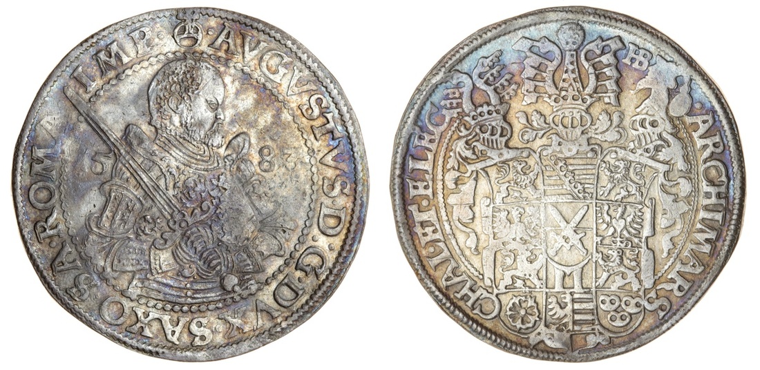 (x) Germany, Saxony, Albertine line, August (1553-86), Taler, 1583, Dresden, armoured bust with sword right, dividing date, rev. shield with three helms (Dav.9798), very fine