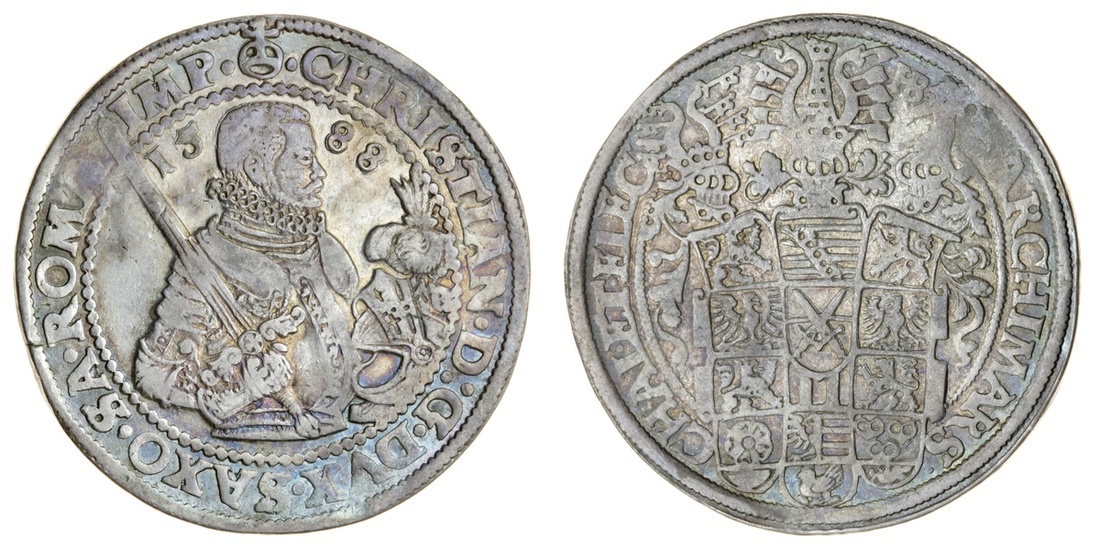 (x) Germany, Saxony, Albertine line, Christian (1586-91), Taler, 1588, Dresden, armoured bust with sword right, dividing date, rev. shield with three helms (Dav.9806), old cabinet tone, very fine