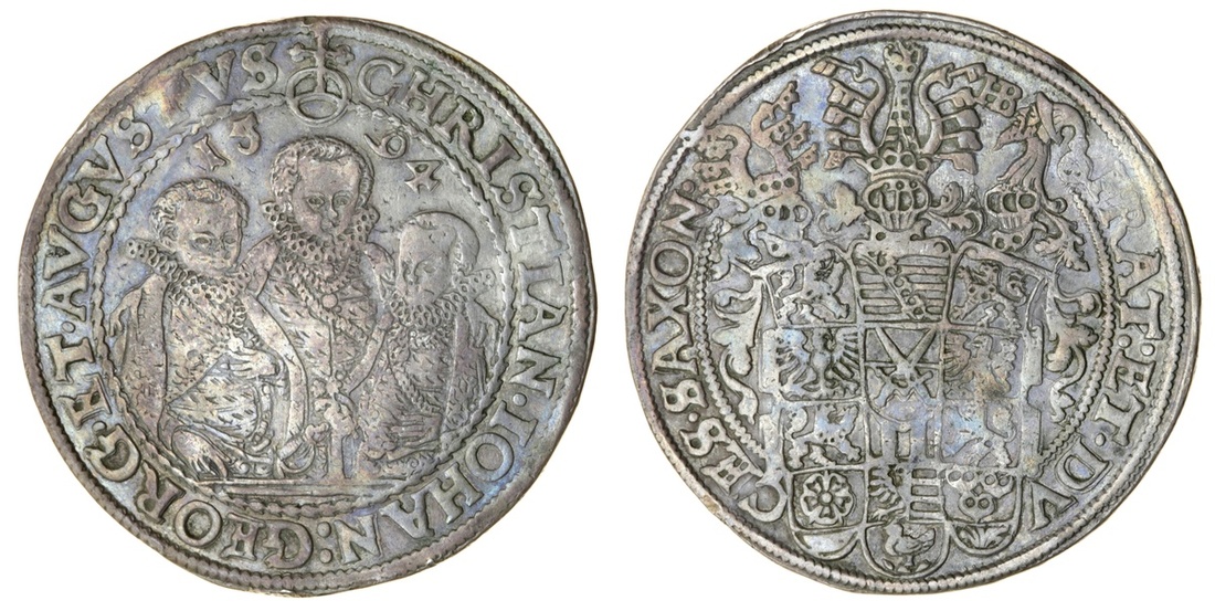 (x) Germany, Saxony, Christian II, Johann Georg and August (1591-1611), Taler, 1594, Dresden, three brothers, half-length, facing, rev. shield with three helms (Dav.9820), old cabinet tone, very fine