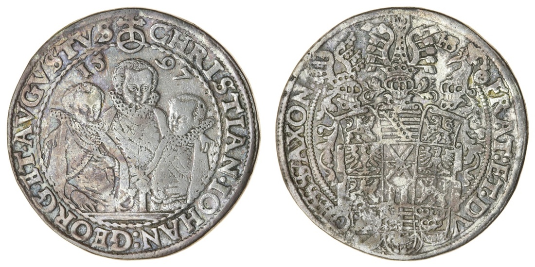 (x) Germany, Saxony, Christian II, Johann Georg and August (1591-1611), Taler, 1597, Dresden, three brothers, half-length, facing, rev. shield with three helms (Dav.9820), old cabinet tone, good fine
