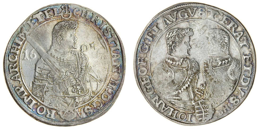 (x) Germany, Saxony, Christian II, with Johann Georg and August (1591-1611), Taler, 1605, Dresden, Christian, half-length, in armour and holding sword, right, rev. Johann Georg and August, half-length, in armour, facing one another (Dav.7566), very fine