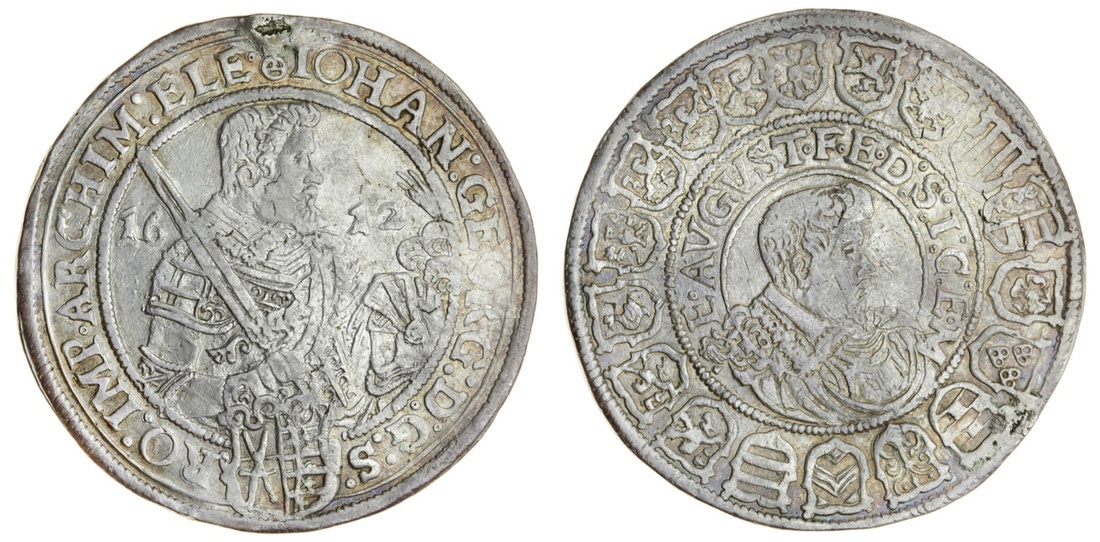 (x) Germany, Saxony, Johann Georg II and August of Naumberg (1611-15), Taler, 1612, Dresden, Johann Georg, half-length, in armour and holding sword, right, rev. August right, in circle of eighteen shields (Dav.7573), mount removed, very fine