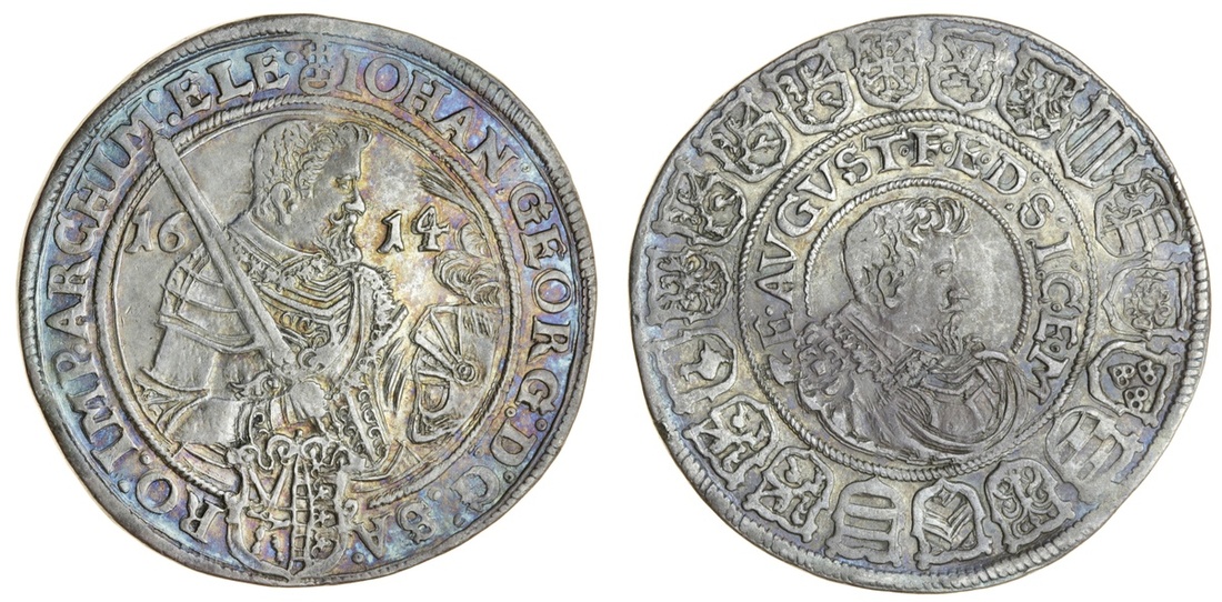 (x) Germany, Saxony, Johann Georg II and August of Naumberg (1611-15), Taler, 1614, Dresden, Johann Georg, half-length, in armour and holding sword, right, rev. August right, in circle of eighteen shields (Dav.7573), old cabinet tone, good very fine