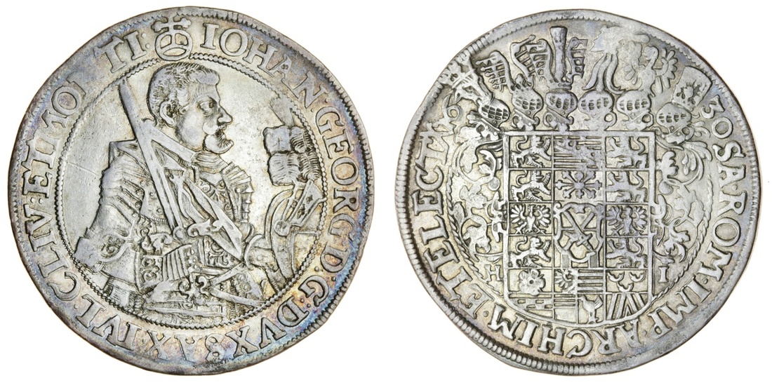 (x) Germany, Saxony, Johann Georg alone (1616-56), Taler, 1630, Dresden, half-length figure right, wearing armour and holding sword, rev. shield, dividing