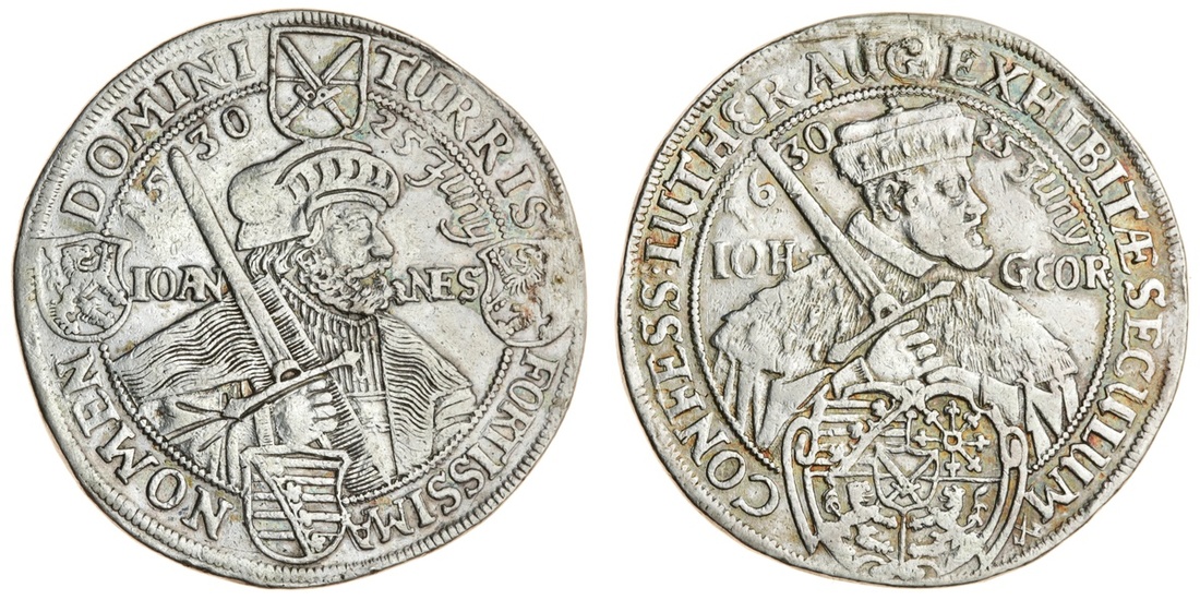 (x) Germany, Saxony, Johann Georg alone (1616-56), Taler, 1630, Dresden, on the centenary of the Augsbuerg Confession, Johann Georg right, wearing Elector's cap and gown and holding sword with both hands, shield below, full date 1630 - 25