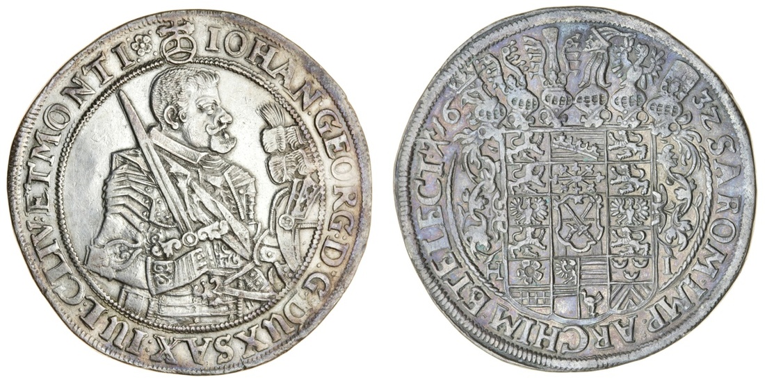(x) Germany, Saxony, Johann Georg alone (1616-56), Taler, 1632, Dresden, half-length figure right, wearing armour and holding sword, rev. shield, dividing