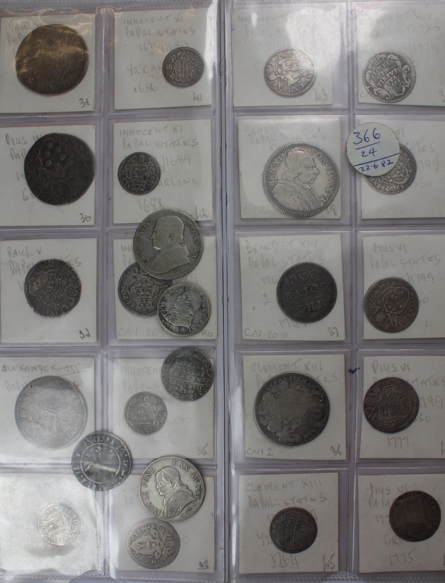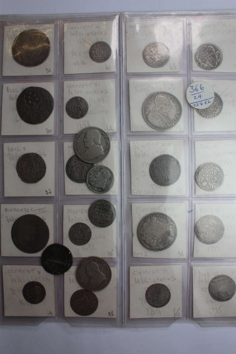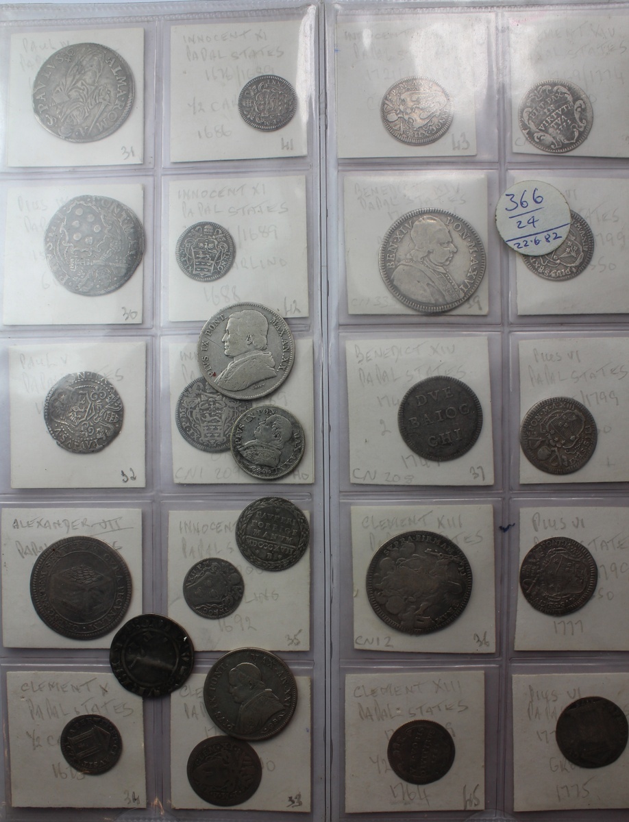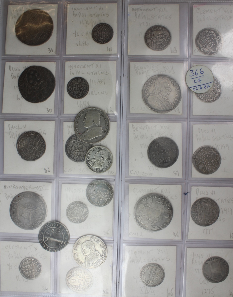 Italy, Vatican, silver coins, a miscellany (25), including: Urban V (1362-70), Sesino, Avignon, 1.45g; also Paul IV (1555-59), Guilio, 1555-59 (Berman 1046), small lamination flaw, otherwise fine; another, Pius IV (1559-65), Guilio (Berman 1080); Paul V (1605-21), ½-Guilio; Alexander VII (1655-87), Guilio (Berman 1904; CNI XVI 405/26-9); Clement X, ½-Carlino, 1675, creased, fine; Innocent XI (1676-89) (3), Carlino; also ½-Carlinos, 1686; 1688 (2); and, Innocent XII (1691-1700), ½-Carlino, 1692; 1700; Clement XI (1700-21), Carlino; Innocent XIII (1721-24), Carlino; Benedict XIV (1740-58) (2), 2-Baiocchi (CN 208); another, 2-Guilios (CN 335); Clement XIII (1758-69) (2), 2-Guilios, 1758 (CN 12); also, ½-Grosso, 1764; Clement XIV (1769-74), Grosso, 1771 (CN 119); also, Pius VI (1775-99), Grossos (4), 'AUXILIUM DE SANCTO types (3), dateless (2); another, 1777; additionally 1775; Pius VII, Grosso, 1817; lastly, Piux IX (3), 20-Baiocchi, 1865-R; another, Lira, 1866; and, 10-Soldi, 1867, generally fine to very fine, an interesting assemblage (25)