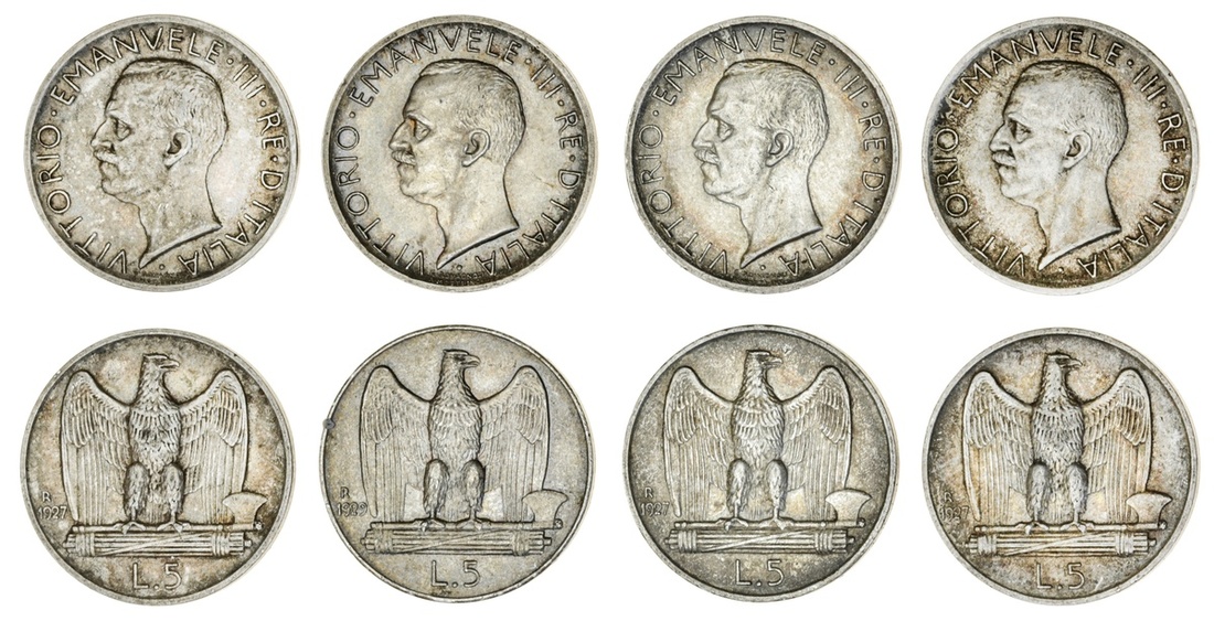 Italy, Vittorio Emanuele III (1900-46), 5-Lire (4), 1927-R [3]; 1929 (Pag. 710a, 712a; Gig. 74a, 76a), generally about very fine, the last much as struck (4)