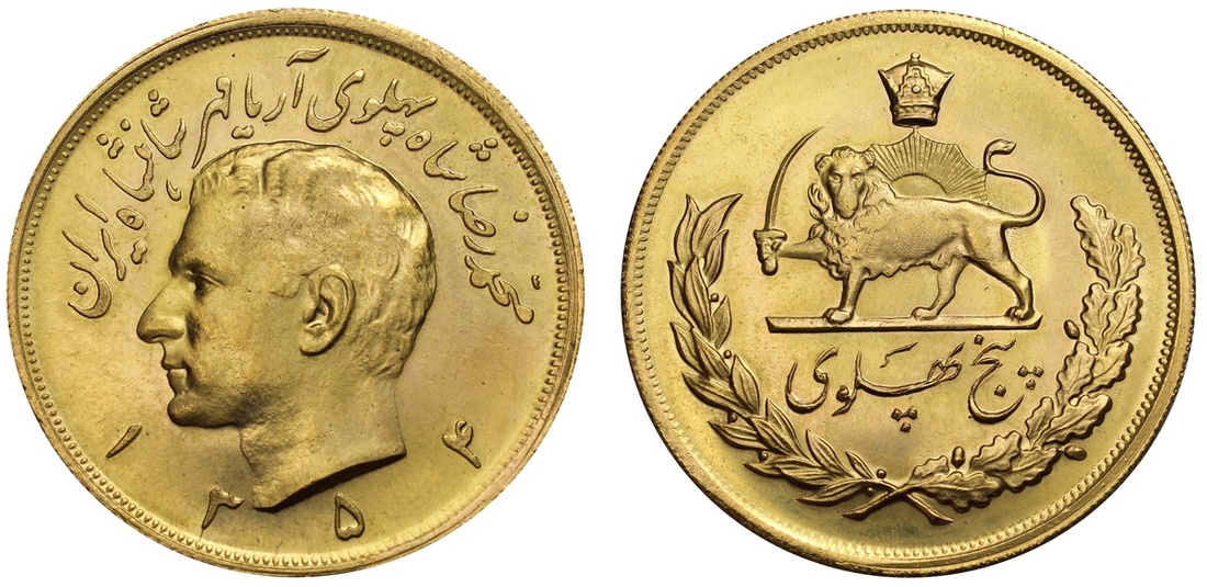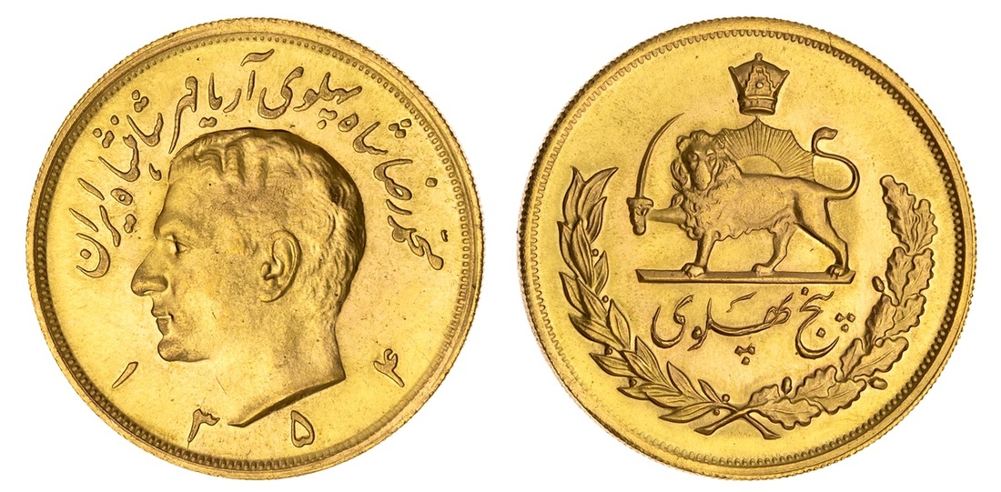 (g) Iran (Persia), Pahlavi Dynasty, Mohammad Reza Shah (1941-76), gold 5-Pahlavi, 40.87g, SH 1354 (1975) (KM1202), extremely fine