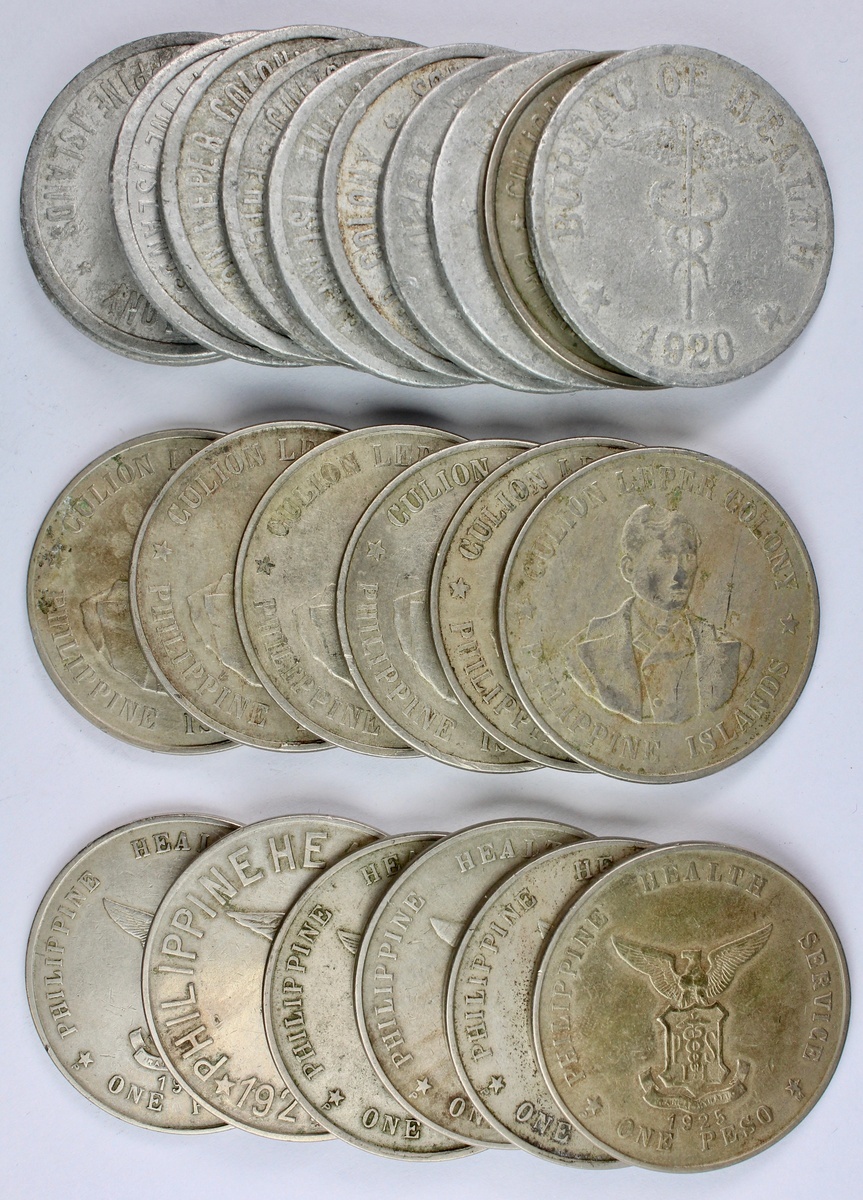 Philippines, Culion Leper Colony (1906-30), second issue, Pesos, Manila (23), 'Bureau of Health' issues (12), in aluminium, 1920 (10) (KM 15); in cupro-nickel, 1922, with countermark, scarce only 8,280 pieces struck (2); third issues, 1925 (11), the first somewhat corroded as expected, the rest generally good fine to good very fine, all scarce, an unusual offering (23)