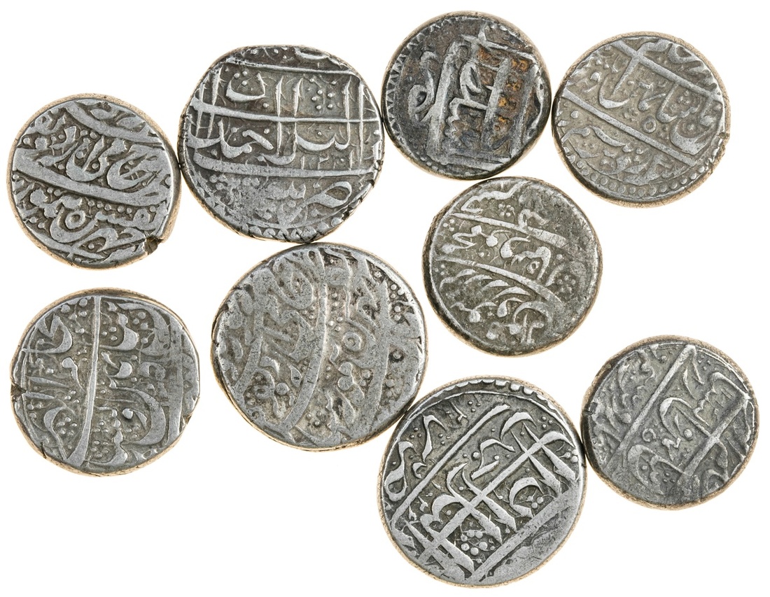 Afghanistan, Durrani, Taimur Shah (as king 1772-93), Rupees (3), Herat (2), AH1201, date unclear, Ahmadshahi, error date AH1026 (1206), Shah Zaman (1793-1801), Rupees (4), Ahmadshahi (2), first inscription, error date AH1201 (1210), second inscription, AH1213, Herat (2), AH1214, 1215, Mahmud Shah (first reign 1801-3), Rupees (2), Herat, AH1216, 1218 (KM 124, 133, A134, 383.2, 388, 398.1), fine to very fine (9)