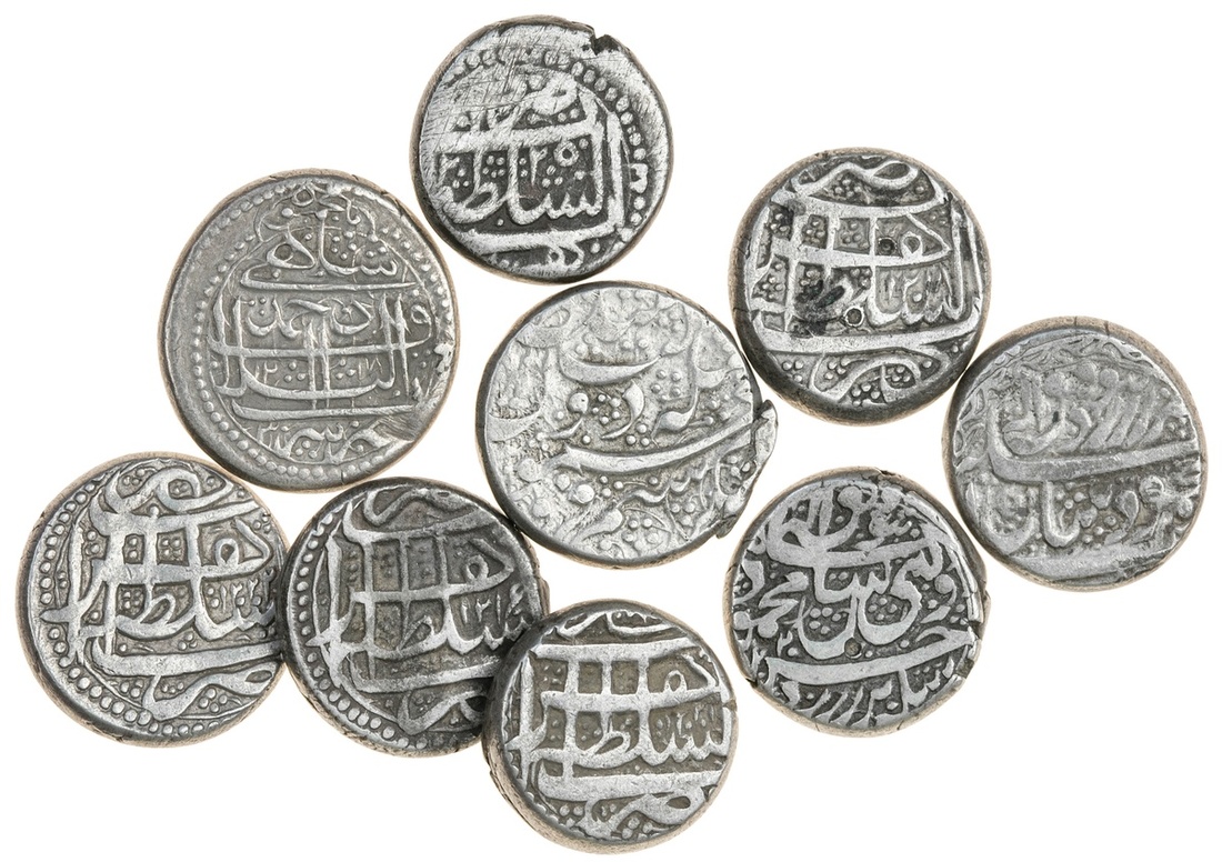 Afghanistan, Durrani, Mahmud Shah (first reign 1801-3), Rupees (5), Ahmadshahi, AH1216, Herat (3), AH1216, 1217, 1218 (second reign 1809-17), Rupees (5), Ahmadshahi, AH1231, mint as tughra, Herat (4), AH1220, 1222, 1223 (last digit unclear), 1225 (KM 143,158.1, 398.1, 398.2), the first very fine on a broad flan, others fine to very fine (9)