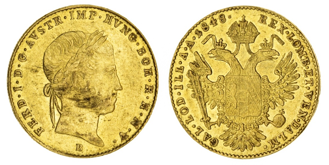 (g) Austria, Ferdinand I (1835-48), Ducat, 1848-B, Kremnitz, 3.47g (F.226 and 481; Herinek 30; KM 2262), linear scuffing across portrait, otherwise about very fine with lustre