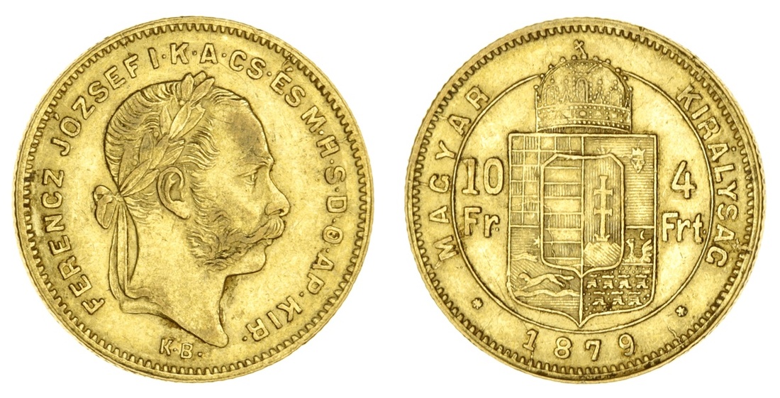 (g) Austro-Hungarian Empire, Franz-Josef I (1848-1916), 10-Francs (4-Forint) 1879-KB, Kremnitz, 3.21g (F.248; Frühwald 1755; KM 454), lightly wiped, otherwise very fine or better, scarce