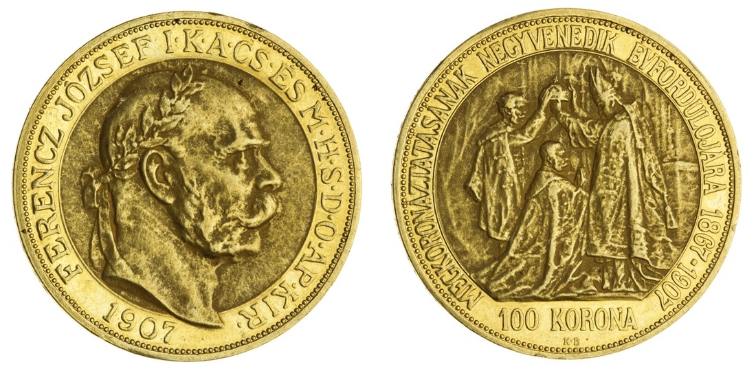 (g) Austro-Hungarian Empire, Franz-Josef I (1848-1916), 100-Corona, 1907-KB, Kremnitz, 40th Anniversary of Imperial Coronation, 33.86g (F.256; Frühwald 2193; Herinek 325; Huszár 2213; KM 490; Novotný 157), characteristically flashy surfaces to periphery, matte to interior, rare with a mintage of only 10,897 pieces, in NGC holder, graded AU58 (Cert. #4861490-001)