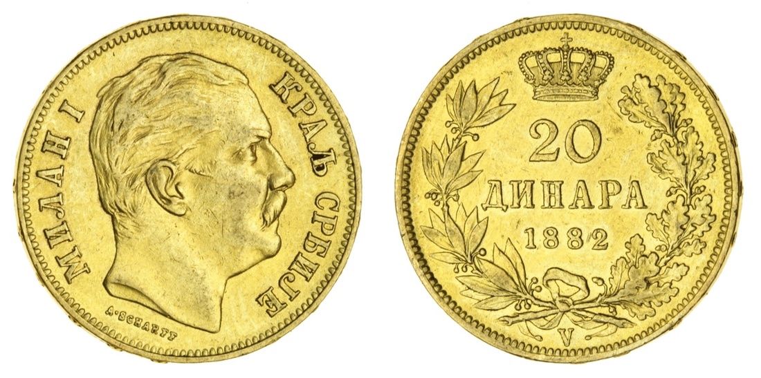 (g) Serbia, Milan I (1868-89), gold 20-Dinara, 1882-A, 6.43g (F.4; KM 16), lustrous, good very fine