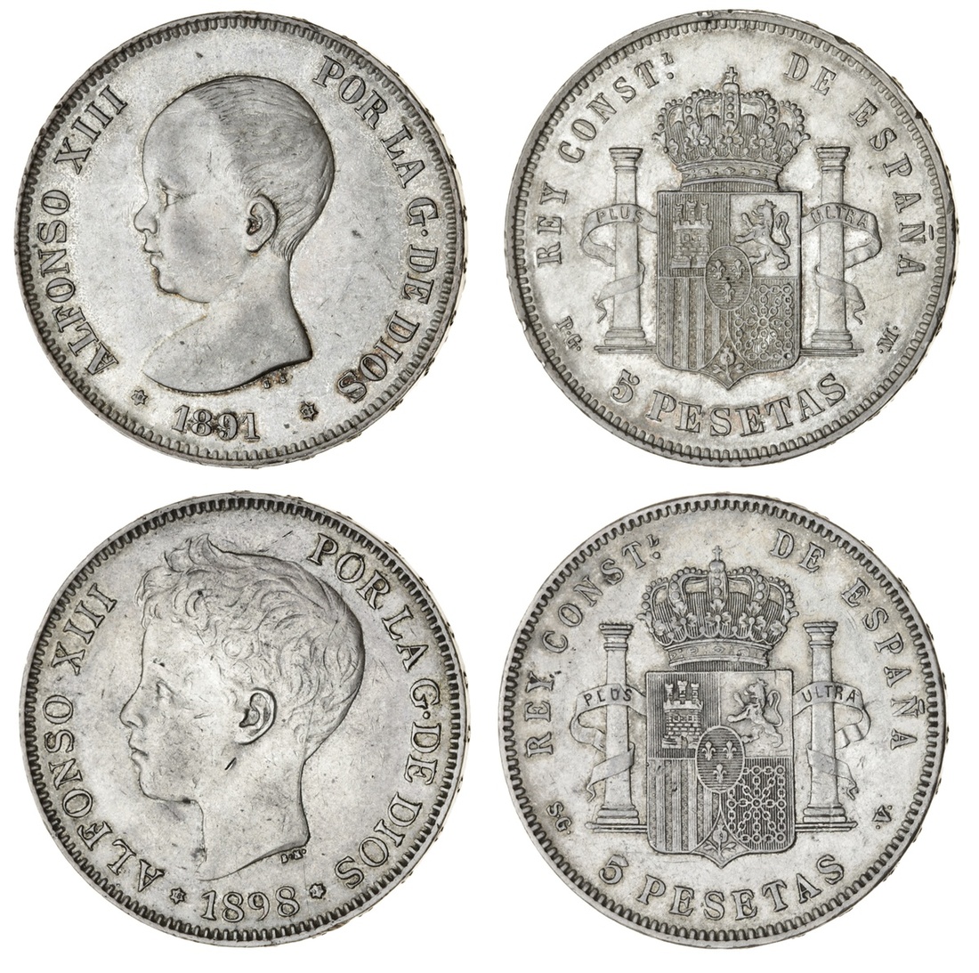 Spain, Alfonso XIII (1885-1931), 5-Pesetas, 1891 (18-91 in stars), baby head left, rev. crowned shield (Dav.342), light old tone, extremely fine, and 5-Pesetas, 1898 (18-98 in stars), boy head left, rev. crowned shield (Dav.344), very fine (2)