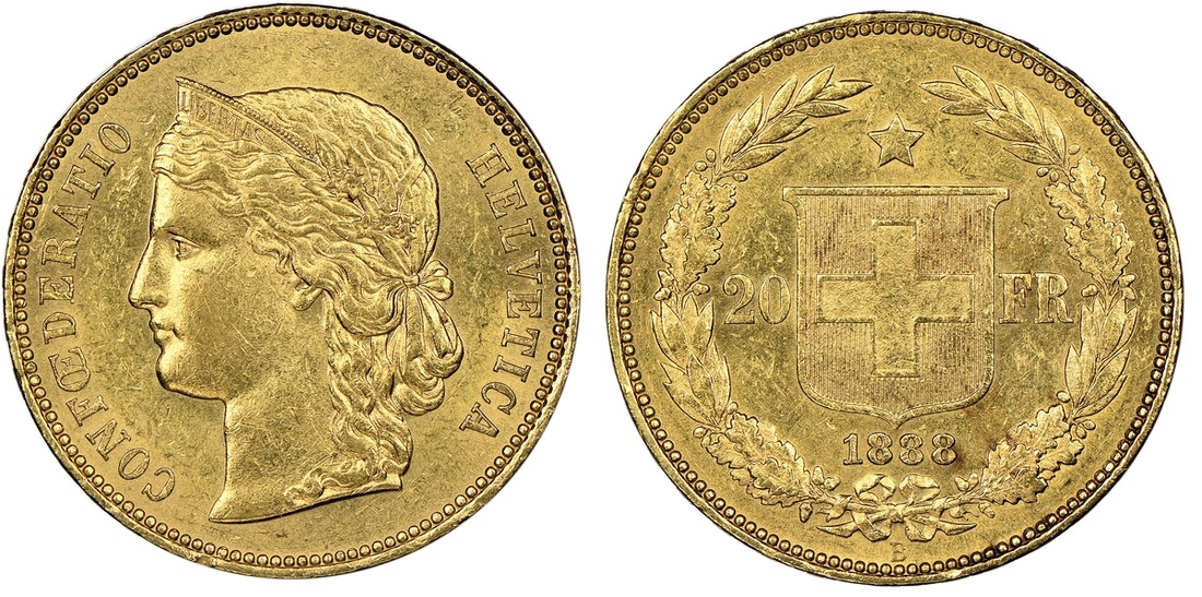 (g) Switzerland, 20 Francs, 1888-B, head left, rev. shield dividing value, date below (Divo 107; F.497; KM 31.3), some light bagmarks, otherwise good extremely fine, rare with a mintage of just 4,224 pieces, in NGC holder, graded AU58
