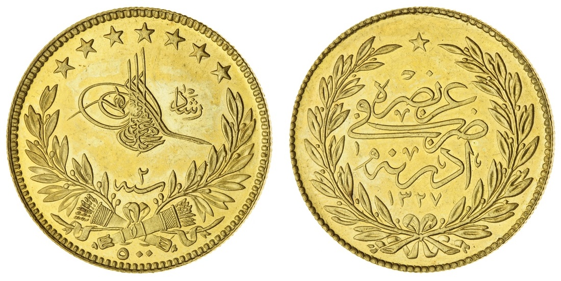 (g) Ottoman Empire, Mehmet V (AH 1327-36 / 1909-18), gold 500-Kurush, AH 1327, year 2 (1910), Toughra, Struck to commemorate the Sultan's Visit to Edirne, 36.06g (Ölcer 35.311; Pere 1007; F.50; KM 758; Schlumberger 778), an excellent striking with gloriously lustrous and often quite brilliant surfaces, very rare, especially in this condition, in NGC holder, graded MS63 ~the single finest certified by NGC or PCGS (Cert. #4861490-007)