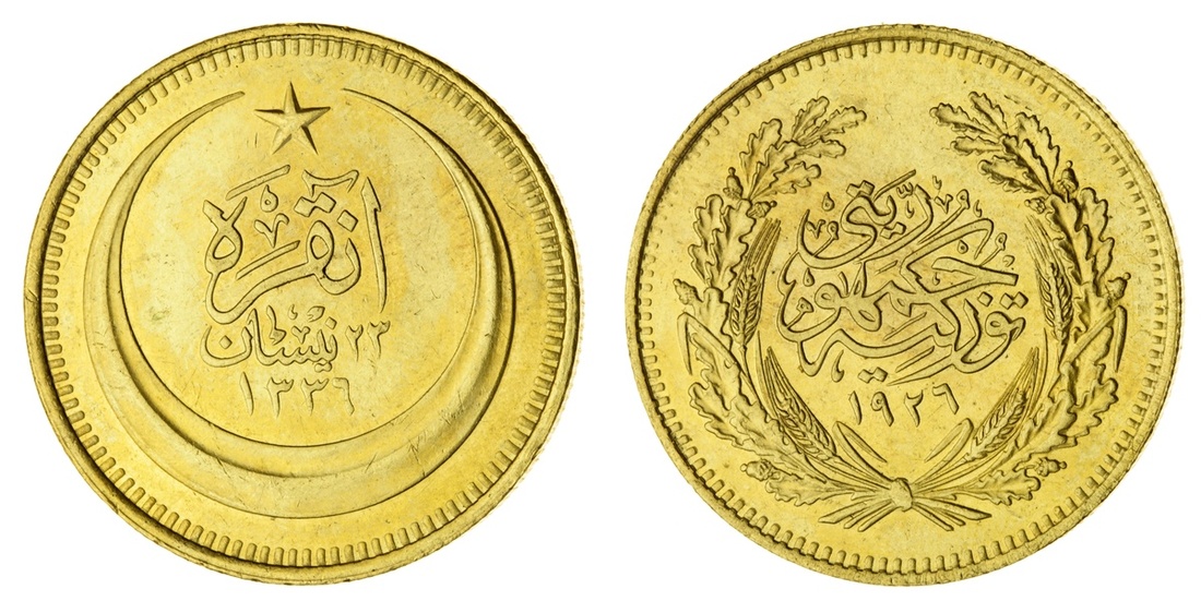 (g) Turkey, Republic, gold 500-Kurush, AH 1336 (1926), 36.08g (F.79; KM 839; Schlumberger 778), lustrous, good extremely fine, in NGC holder, graded MS62 (Cert. #4861490-011)