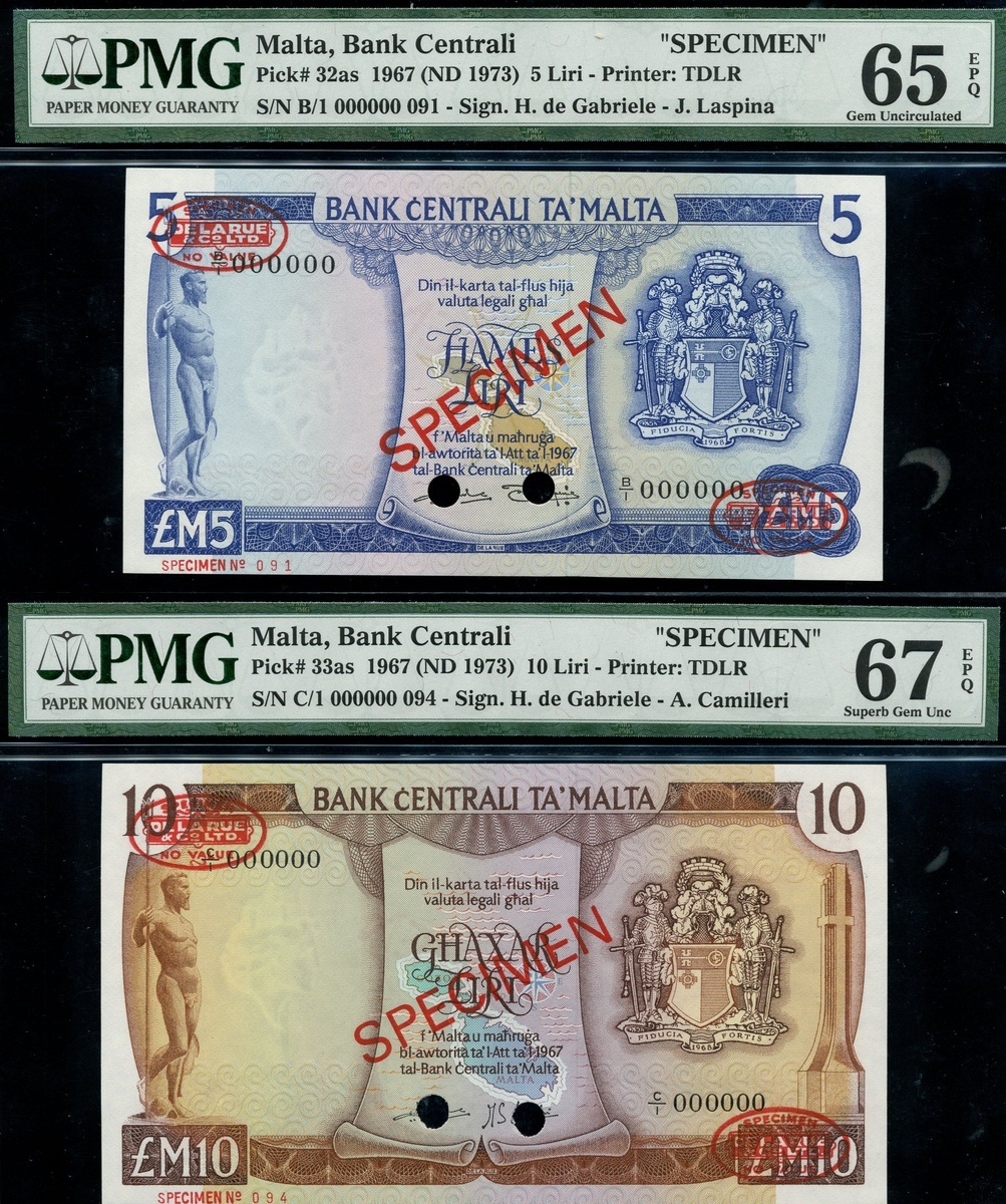 Central Bank of Malta, DLR Specimen, 10 Liri, 1967 ND (1973), Specimen number 052, 5 Liri 1967 ND (1973), Specimen number 091, (Pick 33as, 32as, TBB B206as, B205as2), in PMG holders, first 67 EPQ Superb Gem Uncirculated, second 65 EPQ Gem Uncirculated, highest grades on Track & Price by far (2)