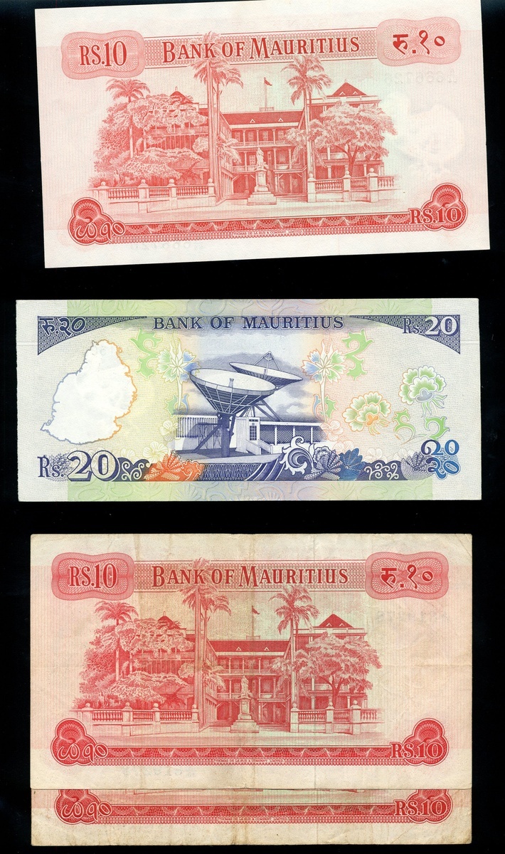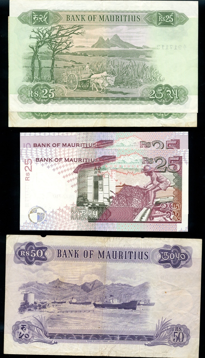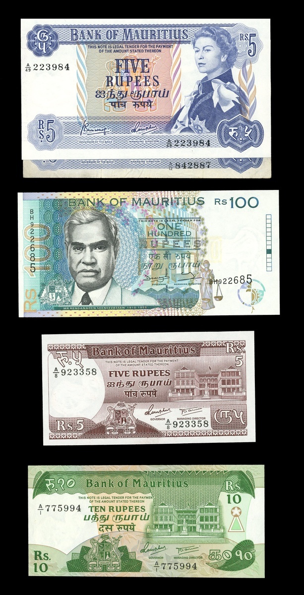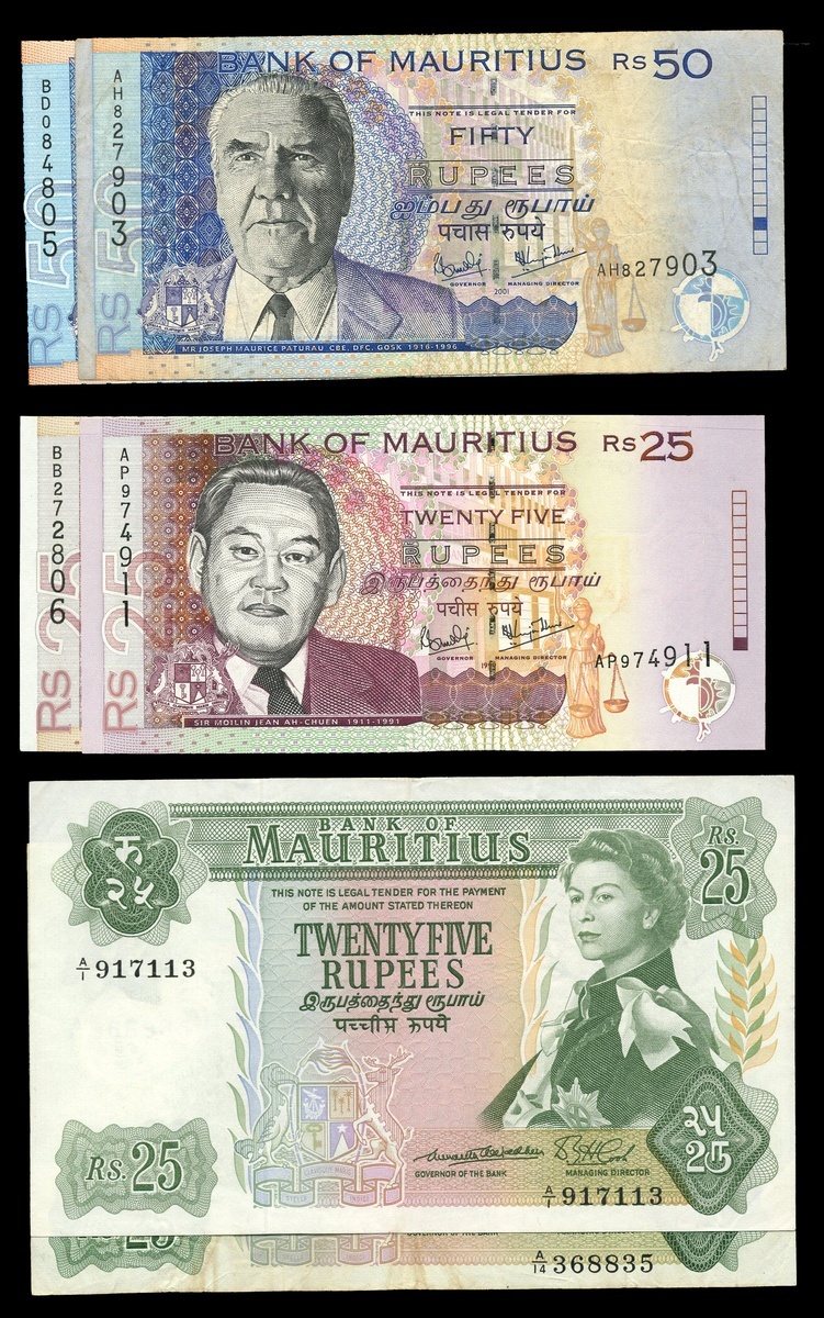 Bank of Mauritius, including, 5 rupees (2), 10 rupees (3), 25 rupees (2), 50 rupees, 1967, 5 rupees, 10 rupees, 20 rupees, 1985-91, 25 rupees (2), 50 rupees (2), 100 rupees, 1998, also a Government of Mauritius, 5 rupees,