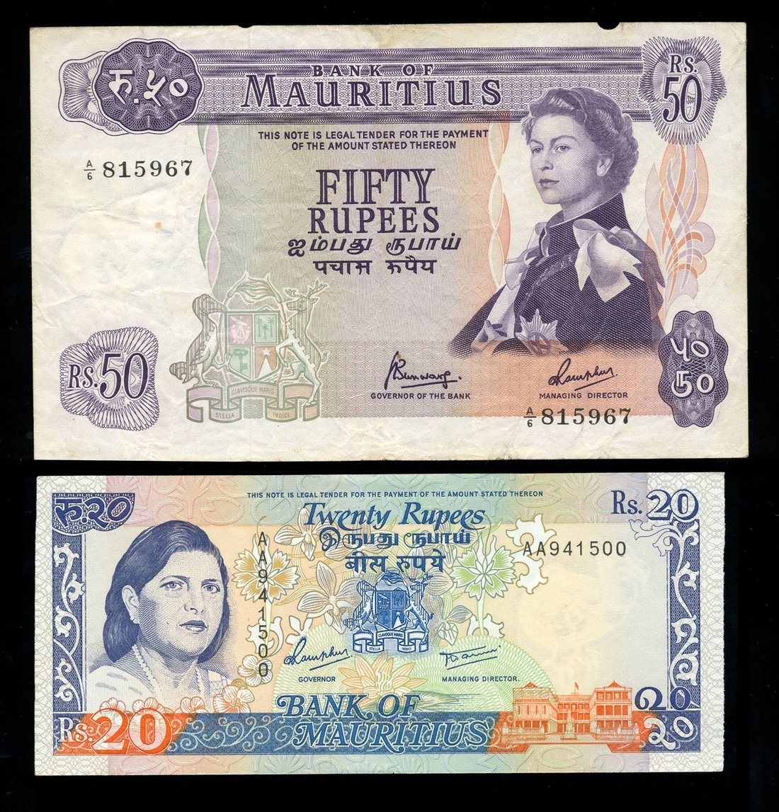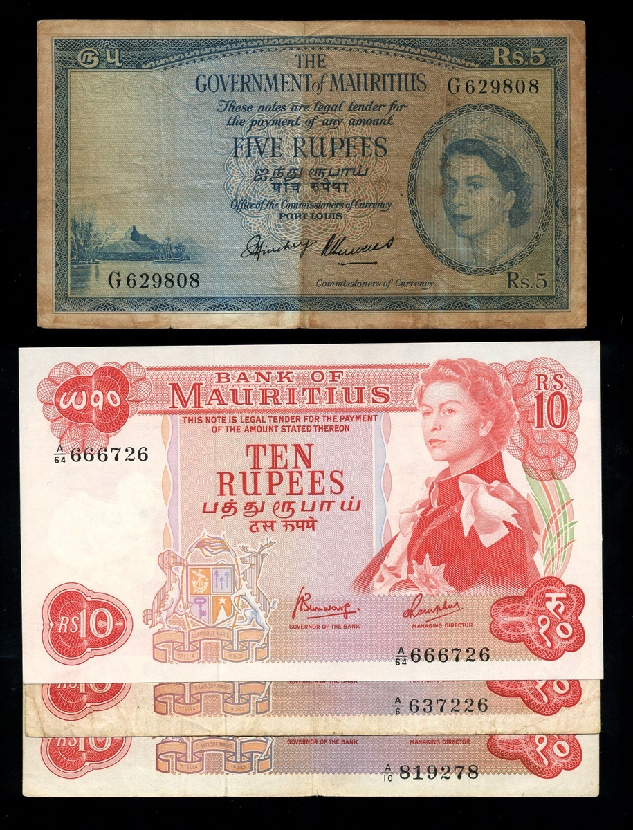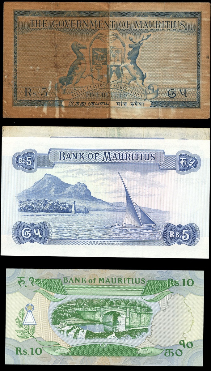 Bank of Mauritius, including, 5 rupees (2), 10 rupees (3), 25 rupees (2), 50 rupees, 1967, 5 rupees, 10 rupees, 20 rupees, 1985-91, 25 rupees (2), 50 rupees (2), 100 rupees, 1998, also a Government of Mauritius, 5 rupees,