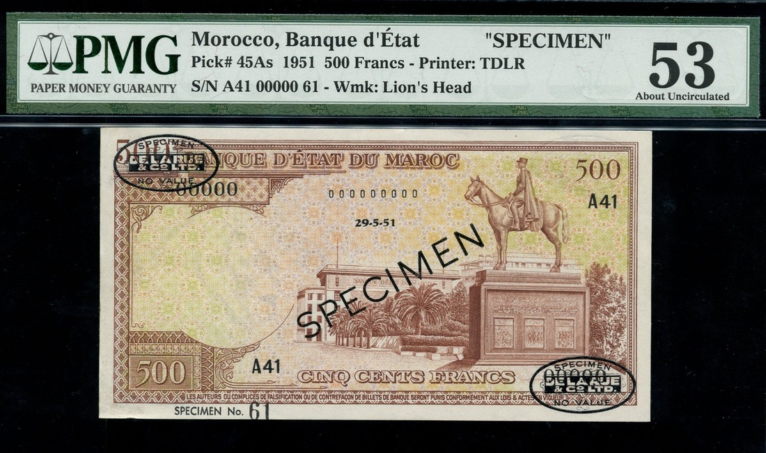 Banque d'Etat du Maroc, De la Rue specimen 500 Francs, 29 May 1951, serial number A41 000000000 61, brown on multicolour underprint, equestrian statue at right, reverse Hassan Tower minaret in Rabat, black DLR oval stamps in upper left and lower right corners and SPECIMEN stamped diagonally across centre on both sides,