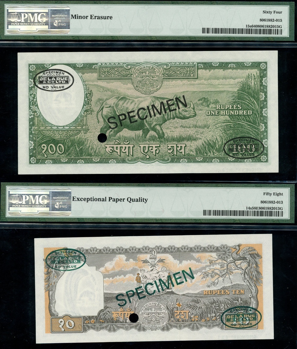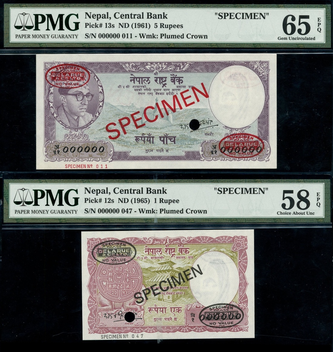 (x) Central Bank of Nepal, A group of 1961-65, DLR Specimen banknotes, including 100 Rupees ND (1961) specimen number 000000 016, 10 Rupees ND (1961) specimen number 000000 021, 5 Rupees ND (1965), specimen number 000000 047, 1 Rupee, ND (1961) specimen number 000000 011,