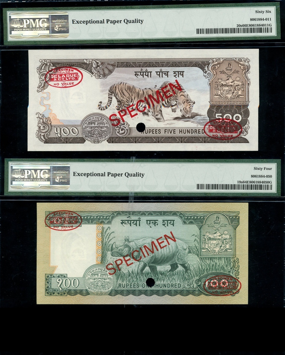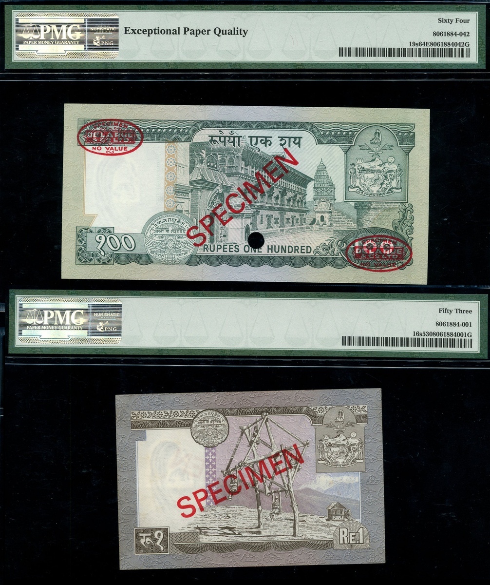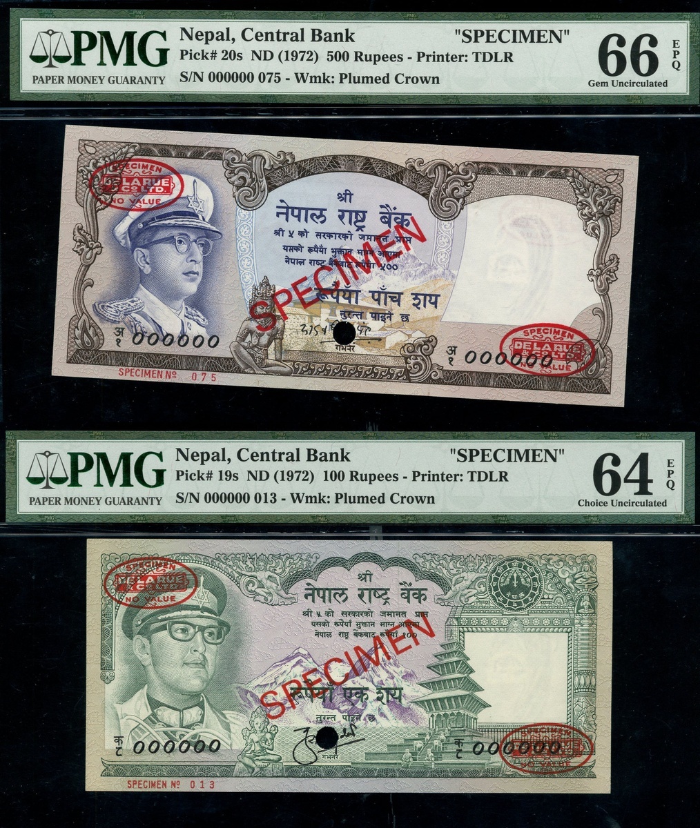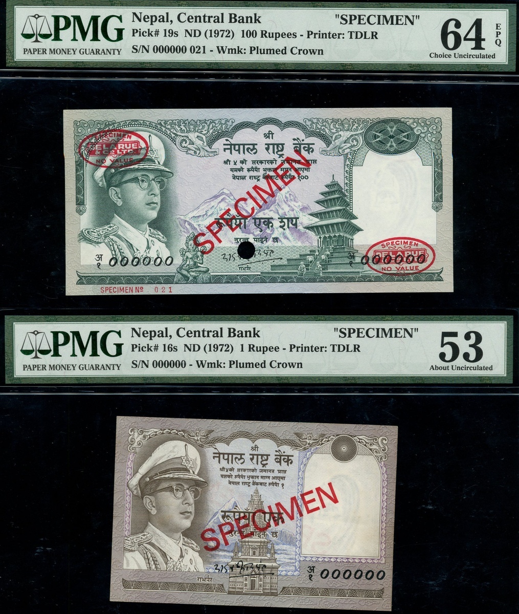 (x) Central Bank of Nepal, Specimen 500 Rupees, ND (1972), specimen number 000000 075, Specimen 100 Rupees (2), ND (1972), specimen number 000000 013/021, Specimen 1 Rupee, ND (1972), specimen number 000000,
