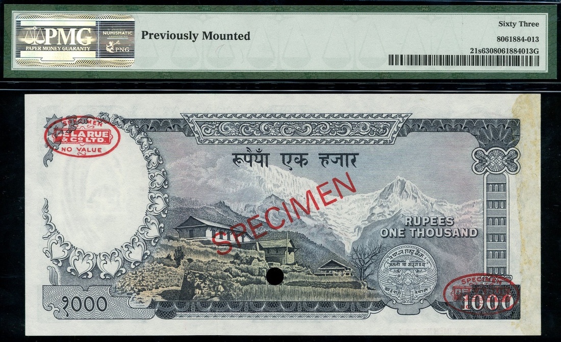 (x) Central Bank of Nepal, Specimen 1000 Rupees, ND (1972), Specimen number 000000 001, (Pick 21s, TBB B214as2), in PMG holder, Previously Mounted, 63 Choice Uncirculated, an outstanding Specimen number 001