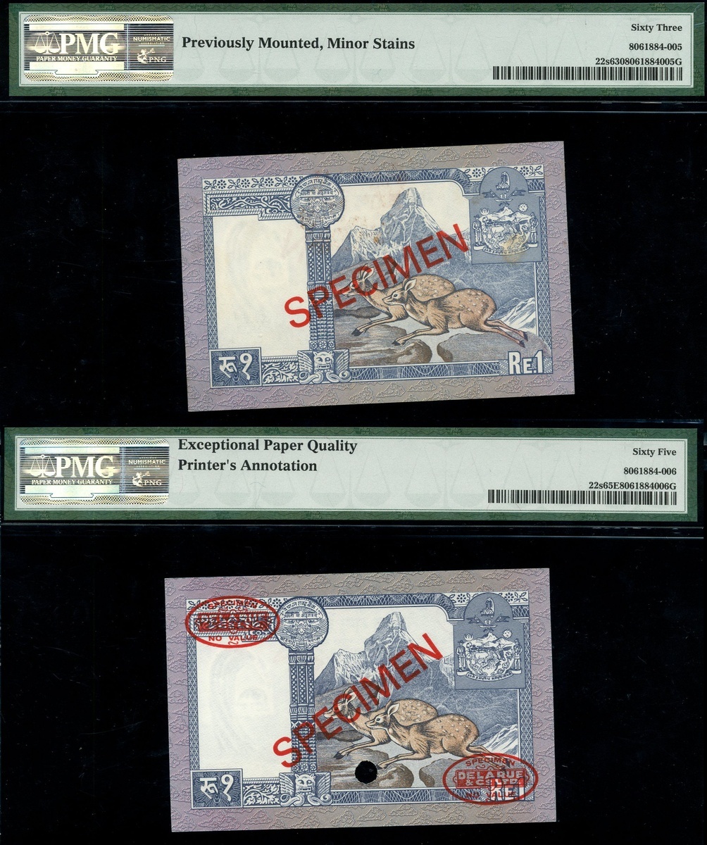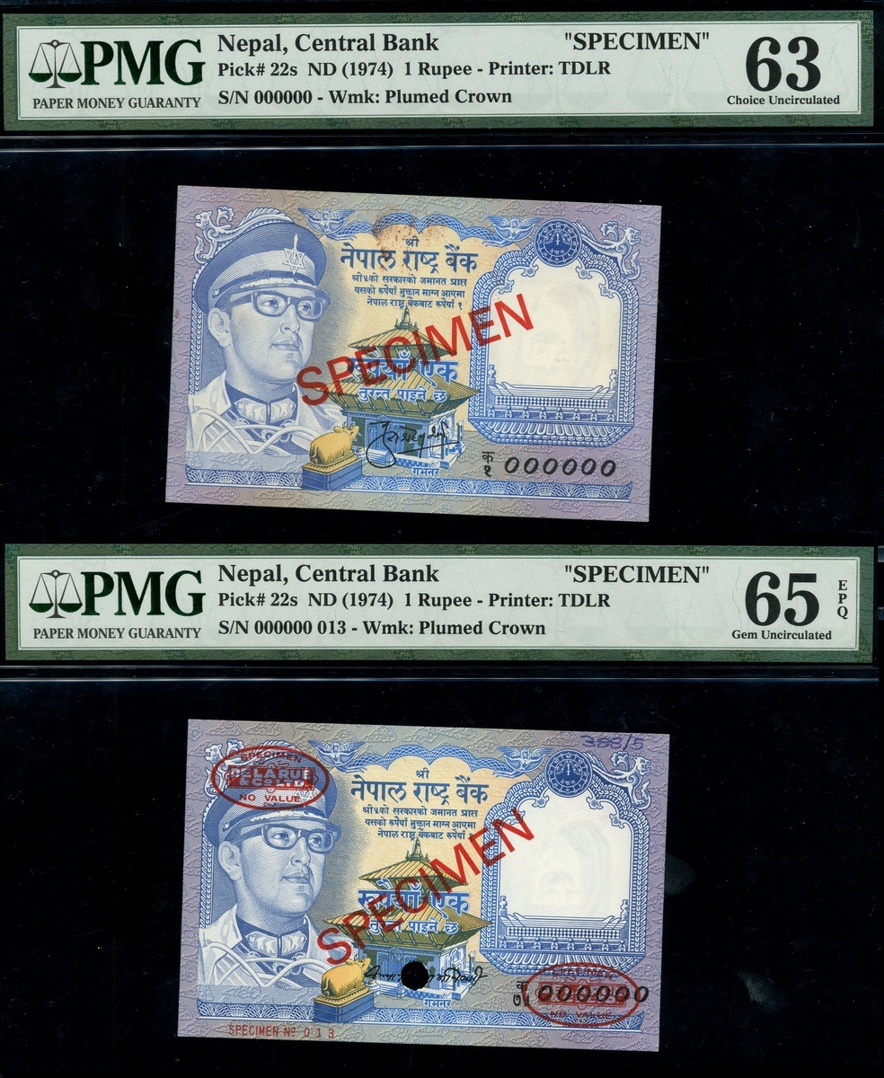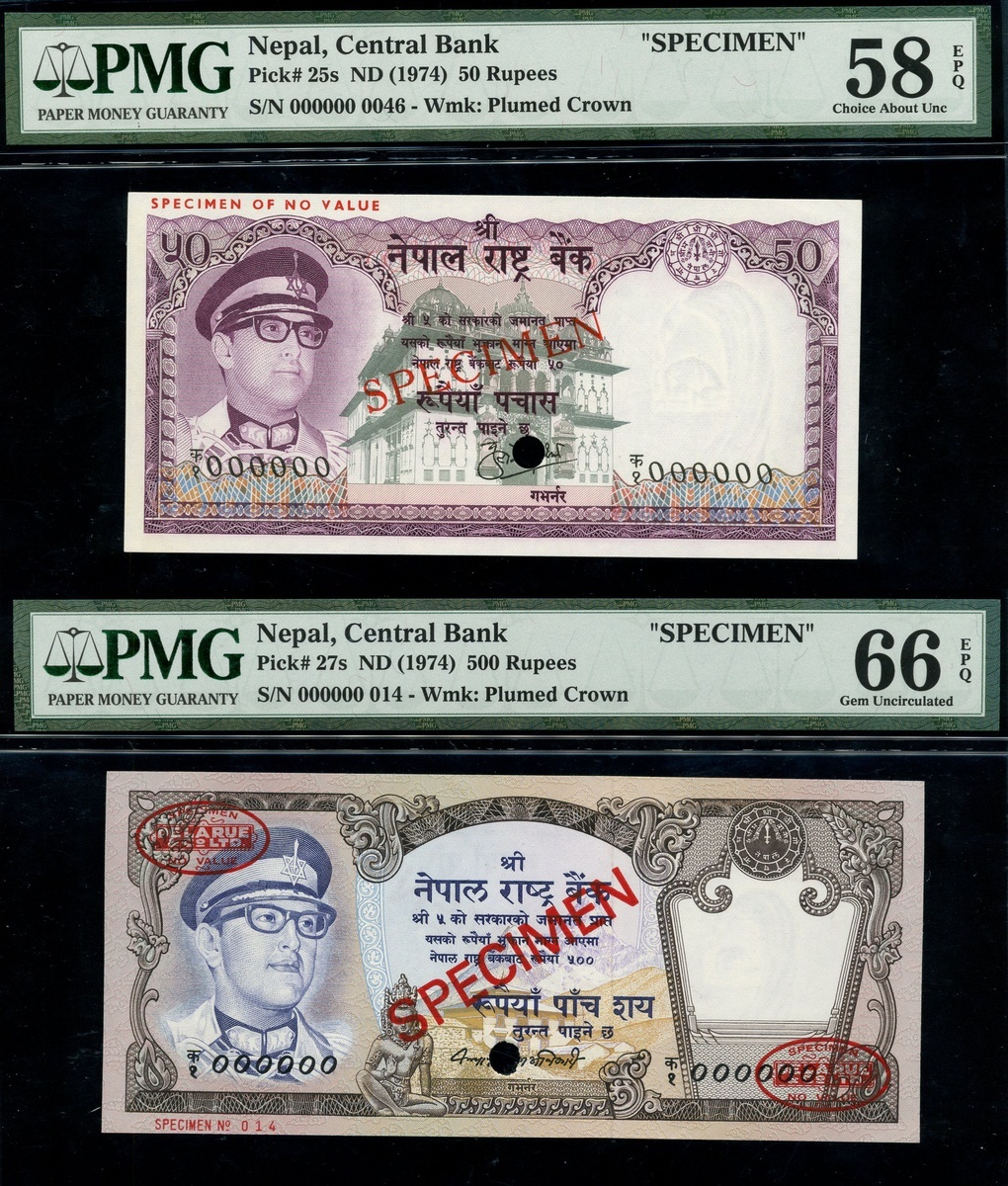 (x) Central Bank of Nepal, A group of Specimen Banknotes, comprising of 500 Rupees ND(1974), serial number 000000 014, red DLR oval upper left and lower right and SPECIMEN printed in red diagonally both front and reverse, hole cancelled, also 50 Rupees ND(1974), serial number 000000 046, also 1 Rupee ND (1974), two, both w. serial number 000000, different SPECIMEN overprints,