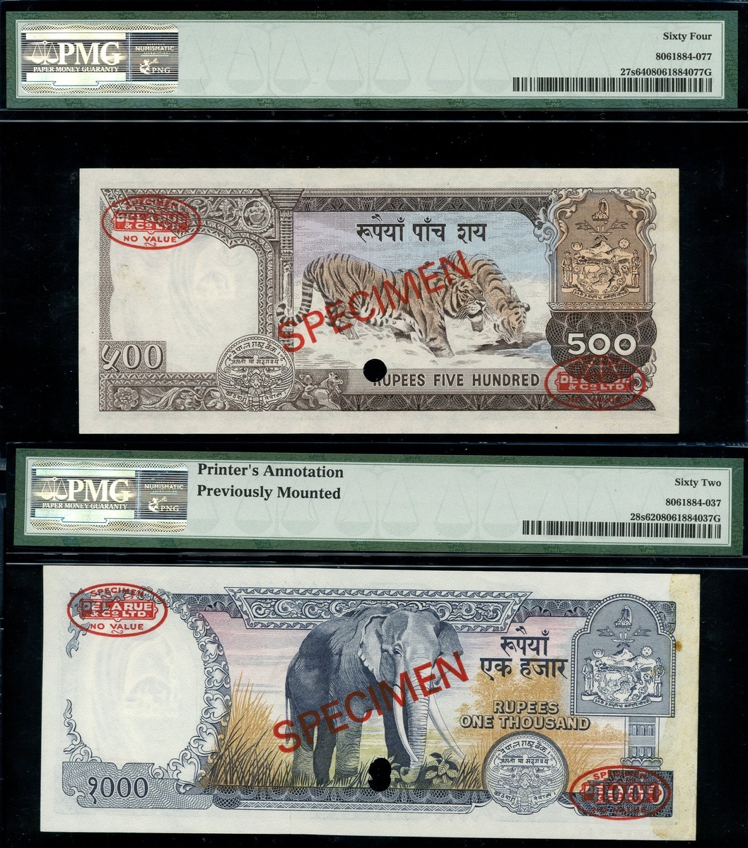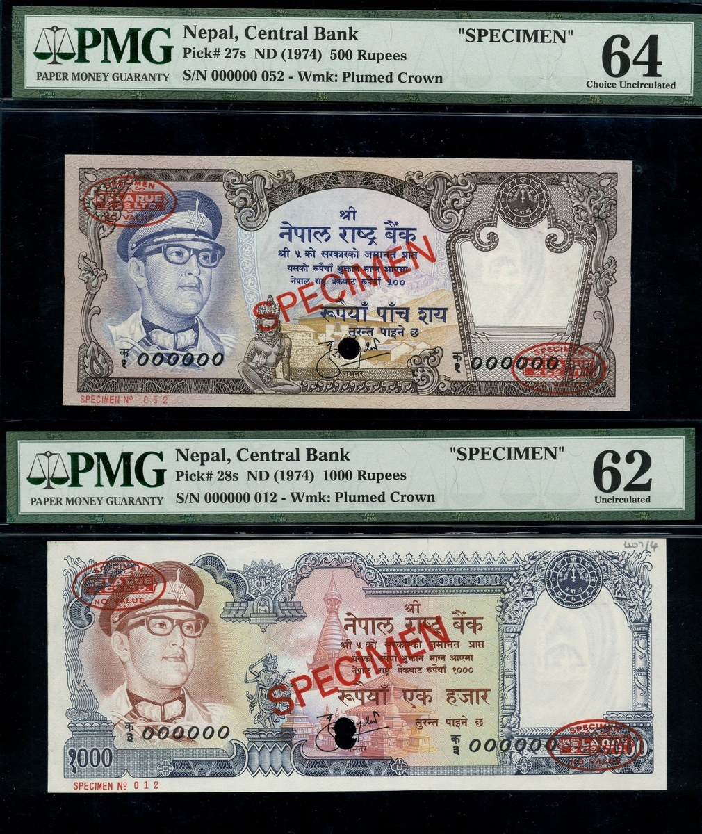 (x) Central Bank of Nepal, Specimen 1000 Rupees, ND (1974), specimen number 000000 012, Specimen 500 Rupees, ND (1974), specimen number 000000 052,
