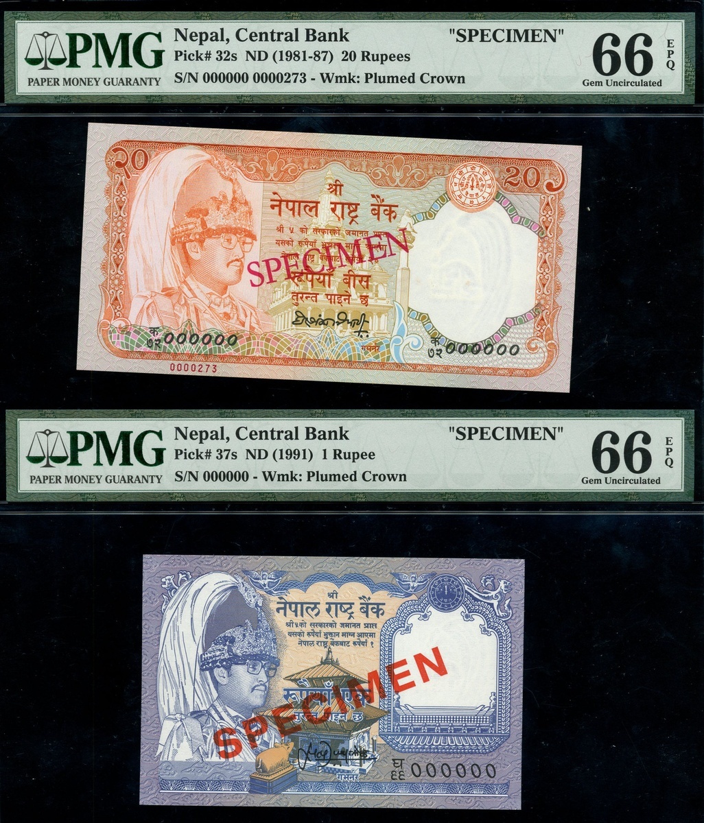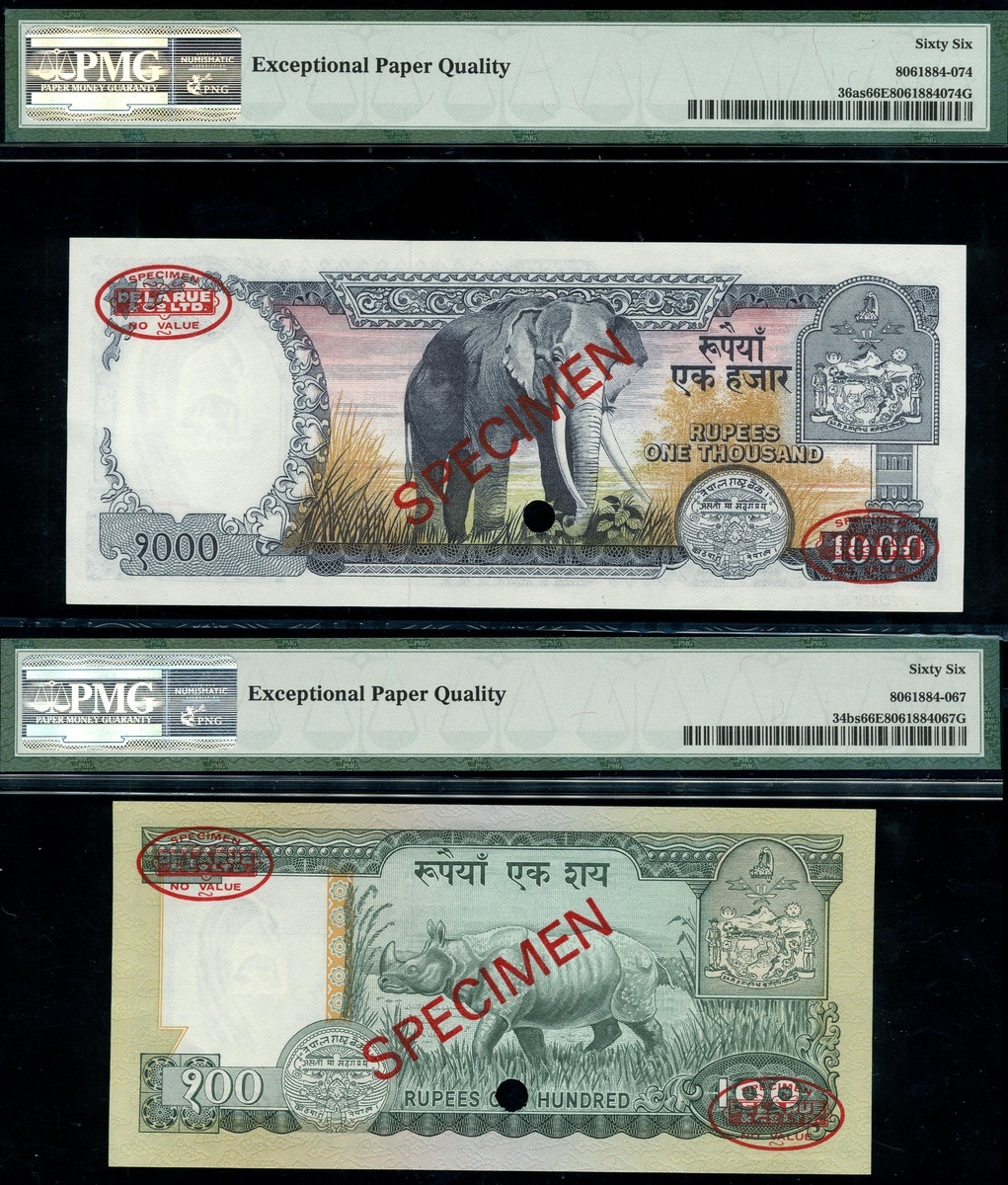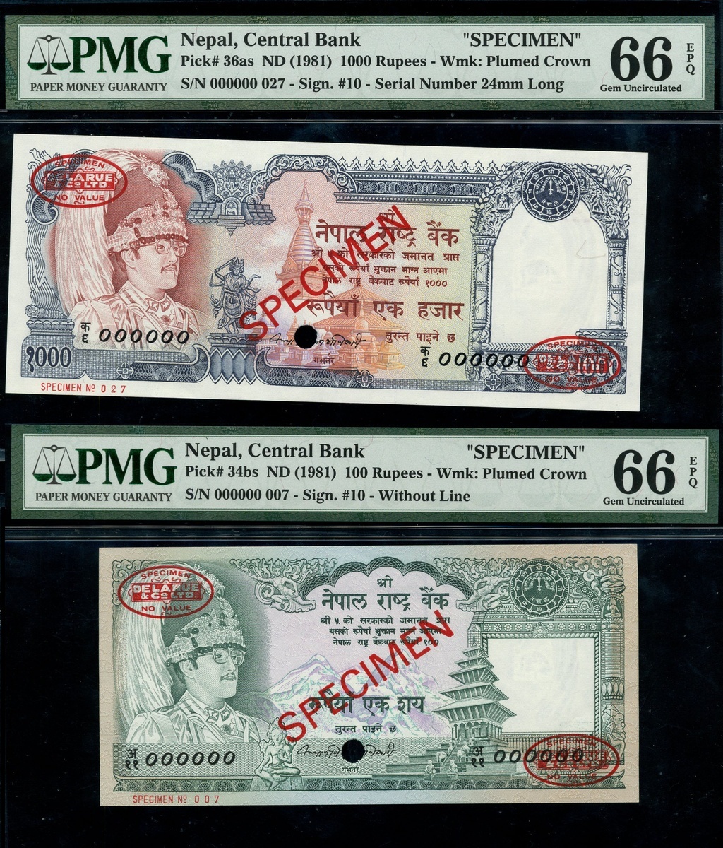 (x) Central Bank of Nepal, A group of Specimen Banknotes including 1000 Rupees, ND (1981), specimen number 000000 027, 100 Rupees, ND (1981) specimen number 000000 007, 20 Rupees ND (1981-87) specimen number 000000 0000273, 1 Rupee, ND (1991), specimen number 000000, also including National Bank of Nepal, 500 Rupees (2) ND (1981-96), specimen number 000000 010,