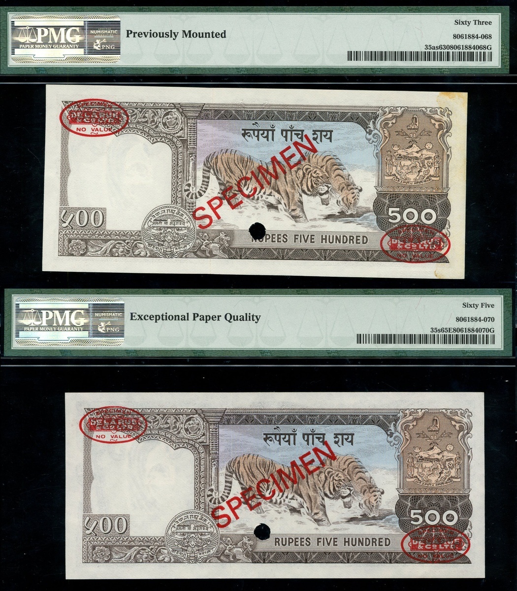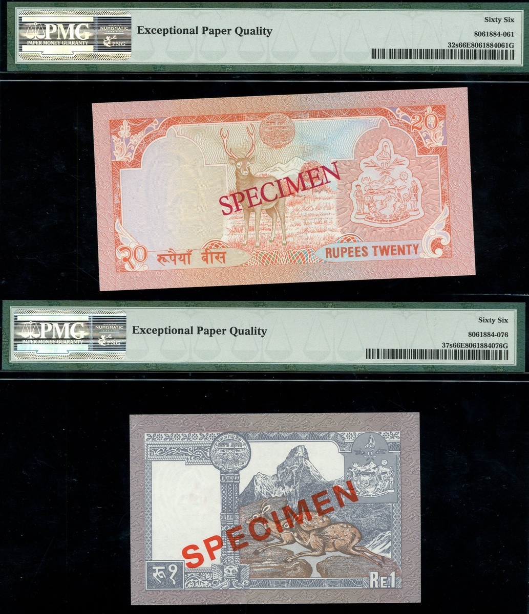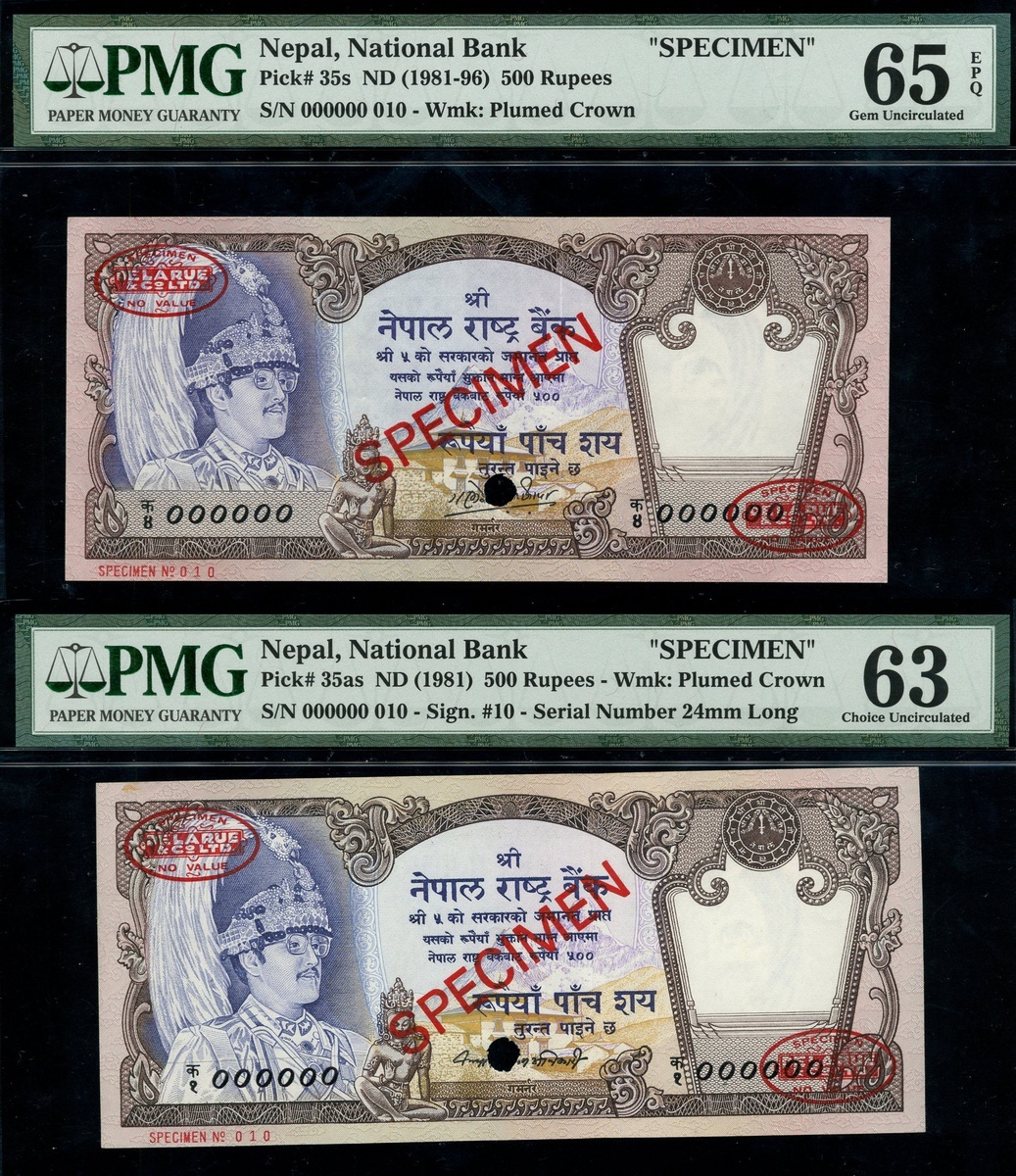 (x) Central Bank of Nepal, A group of Specimen Banknotes including 1000 Rupees, ND (1981), specimen number 000000 027, 100 Rupees, ND (1981) specimen number 000000 007, 20 Rupees ND (1981-87) specimen number 000000 0000273, 1 Rupee, ND (1991), specimen number 000000, also including National Bank of Nepal, 500 Rupees (2) ND (1981-96), specimen number 000000 010,