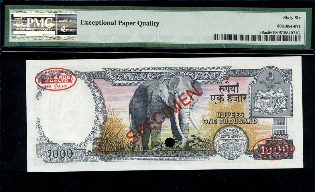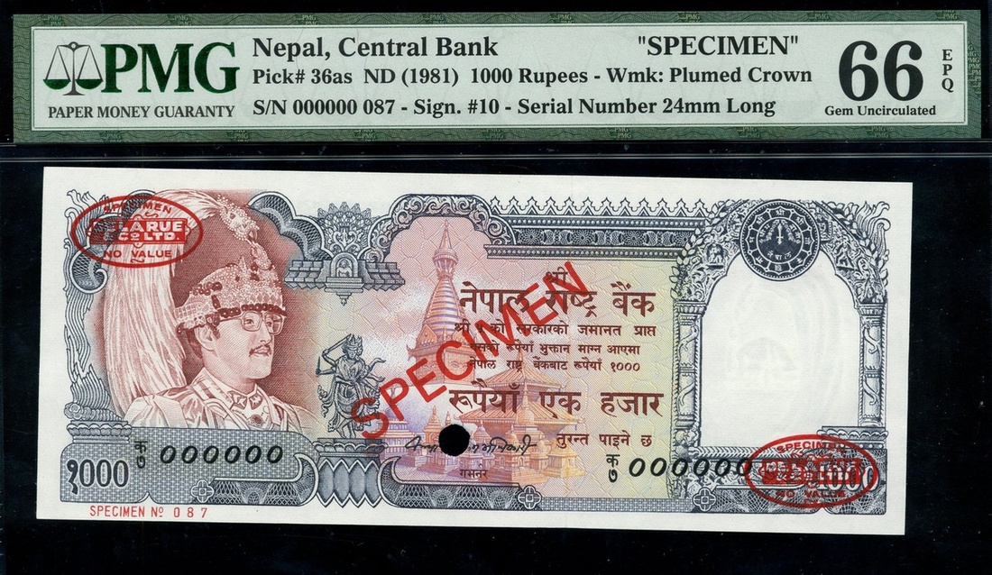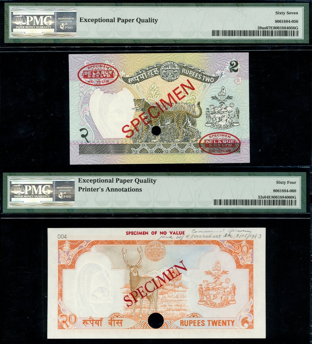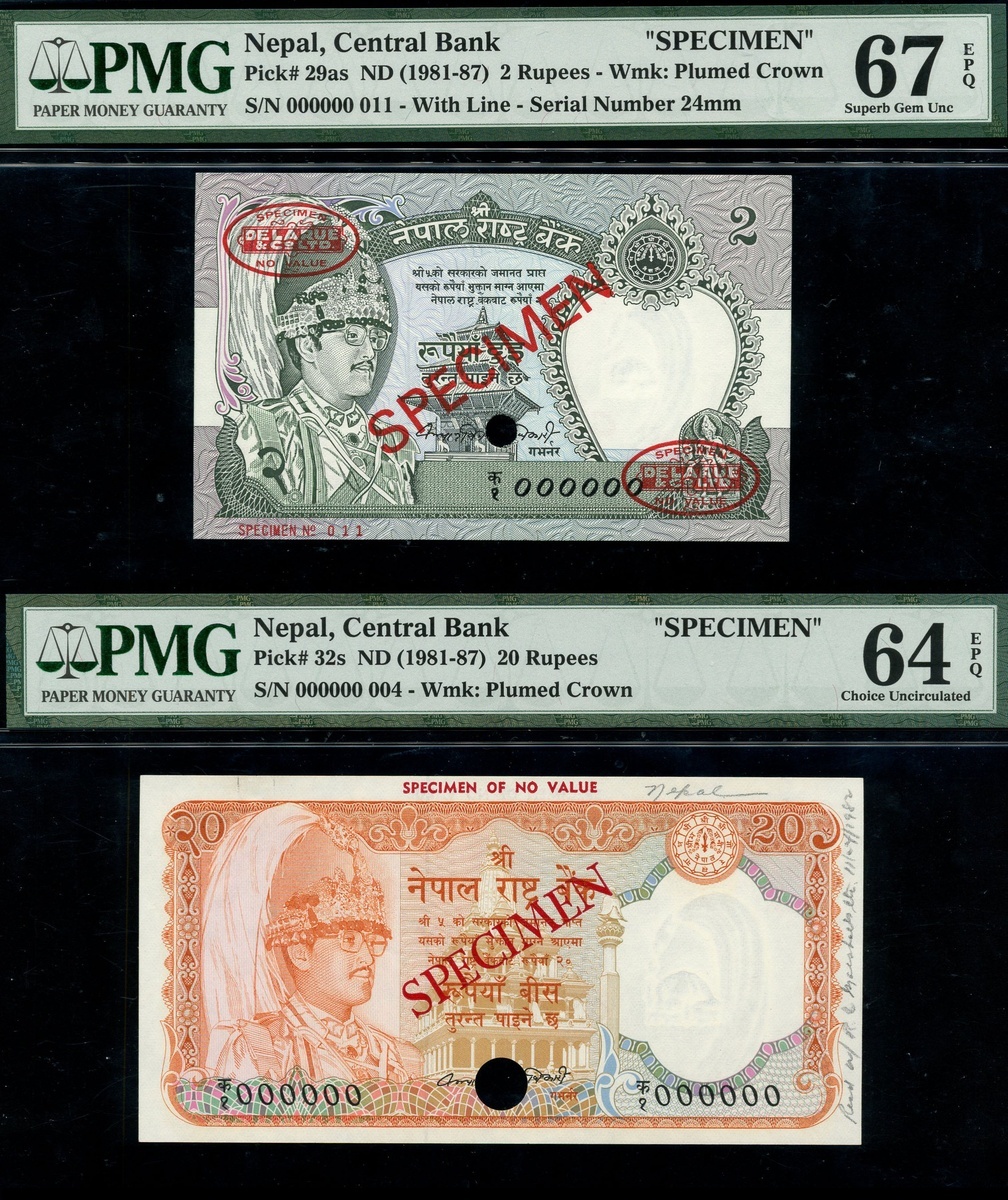 (x) Central bank of Nepal, Specimen 1000 Rupees, ND (1981) specimen number 000000 087, also including Specimen 20 Rupees, ND (1981-87), specimen number 000000 004, Specimen 2 Rupees, ND (1981-87) specimen number 000000 011,