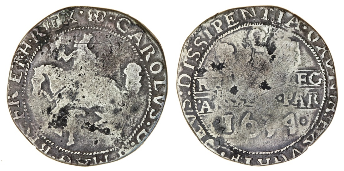 Charles I (1625-49), Halfcrown, a contemporary forgery from false dies, struck in base silver, in the style of Oxford, '1634', 12.38g, 12h, m.m. '88', •(m.m.)•