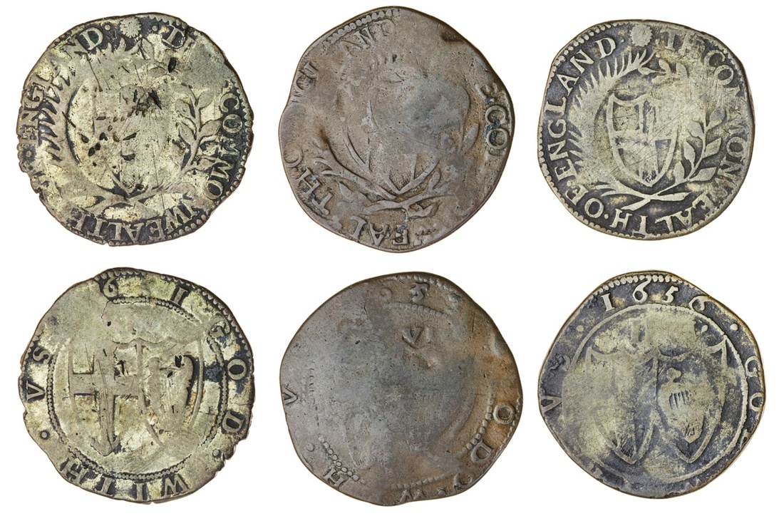 Commonwealth (1649-60), Halfcrowns, contemporary forgeries in base alloys (3), including, 1651, 12.89g, 12h (cf. ESC 17 [426]); another, 1653, a copper core, struck with false dies, 11.66g, 9h (cf. ESC 28 [431]); lastly, 1656, 12.44g, 2h, m.m. sun (on obv. only) (cf. ESC 49 [437]; cf. N.2722; cf. S.3215), all worn, good to fair, an interesting and curious group (3)