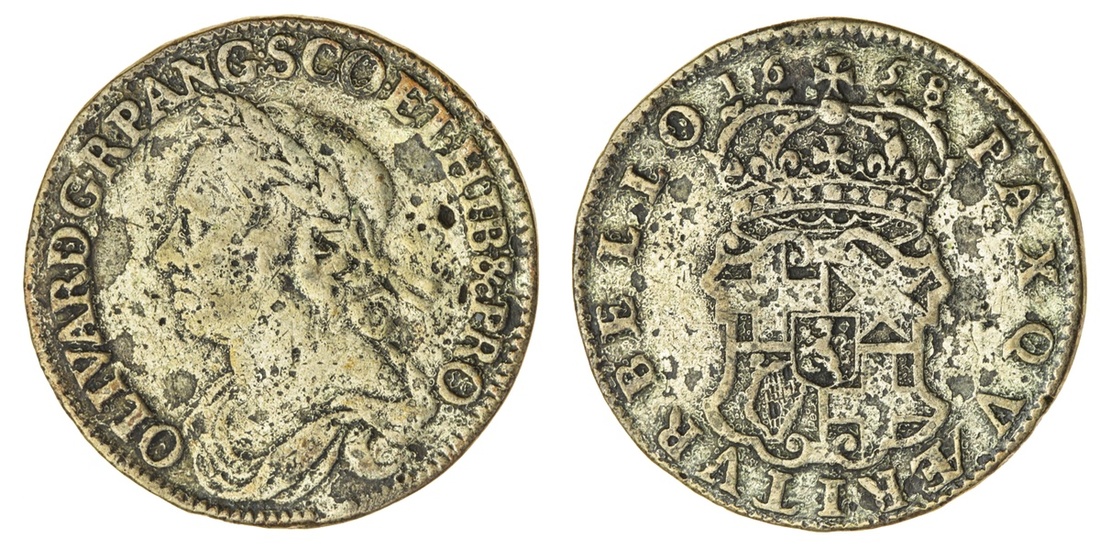 Cromwell, Halfcrown, '1658', a forgery (electrotype ?) in silvered brass, 12.39g, 7h (cf. ESC 252 [447]; cf. S.3227A), surface plating flaked in parts, and details somewhat soapy, otherwise about fine