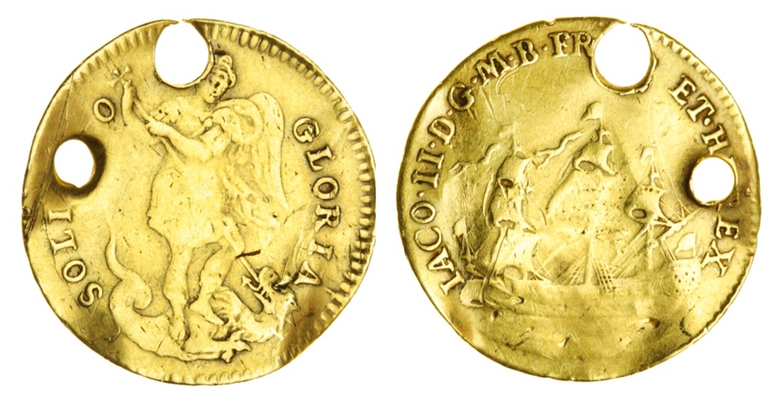 James II (1685-88), gold 'Touchpiece' Angel, 1.81g, 12h (MI 611/19), twice pierced and creased, nonetheless fine details, rare, once handled by the King in gift to sufferers of Scrofula