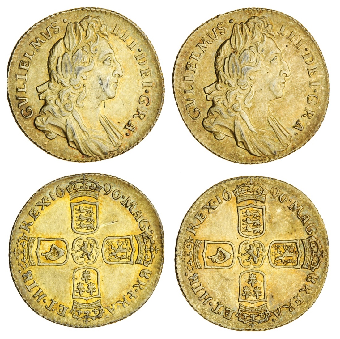 William III (1694-1702), Sixpences, 1696, first bust (2) (ESC 1202 [1533]; S.3520), both evidently gilt to pass as Half-Guineas, one with scuff to cheek otherwise both struck extremely fine (2)