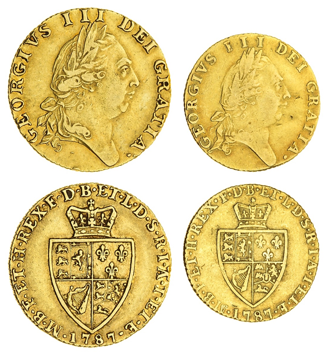 George III (1760-1820), Guinea, 1787, fifth head (MCE 391; S.3729), nick at 6 o'clock and to reverse 3 o'clock, otherwise almost very fine; additionally, Half-Guinea, 1787 (MCE 427; S.3735), scratched and creased, fair to fine (2)
