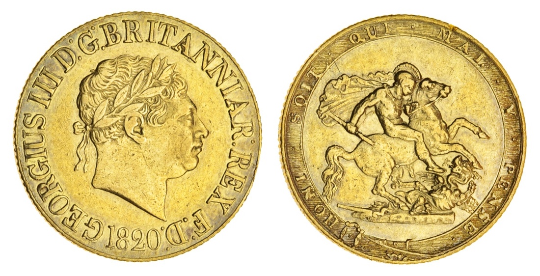 (g) George III (1760-1820), Sovereign, 1820, 'closed 2' (Marsh 4B; MCE 466; S.3785C), a nick to reverse rim at 1 o'clock and lightly cleaned, otherwise very fine